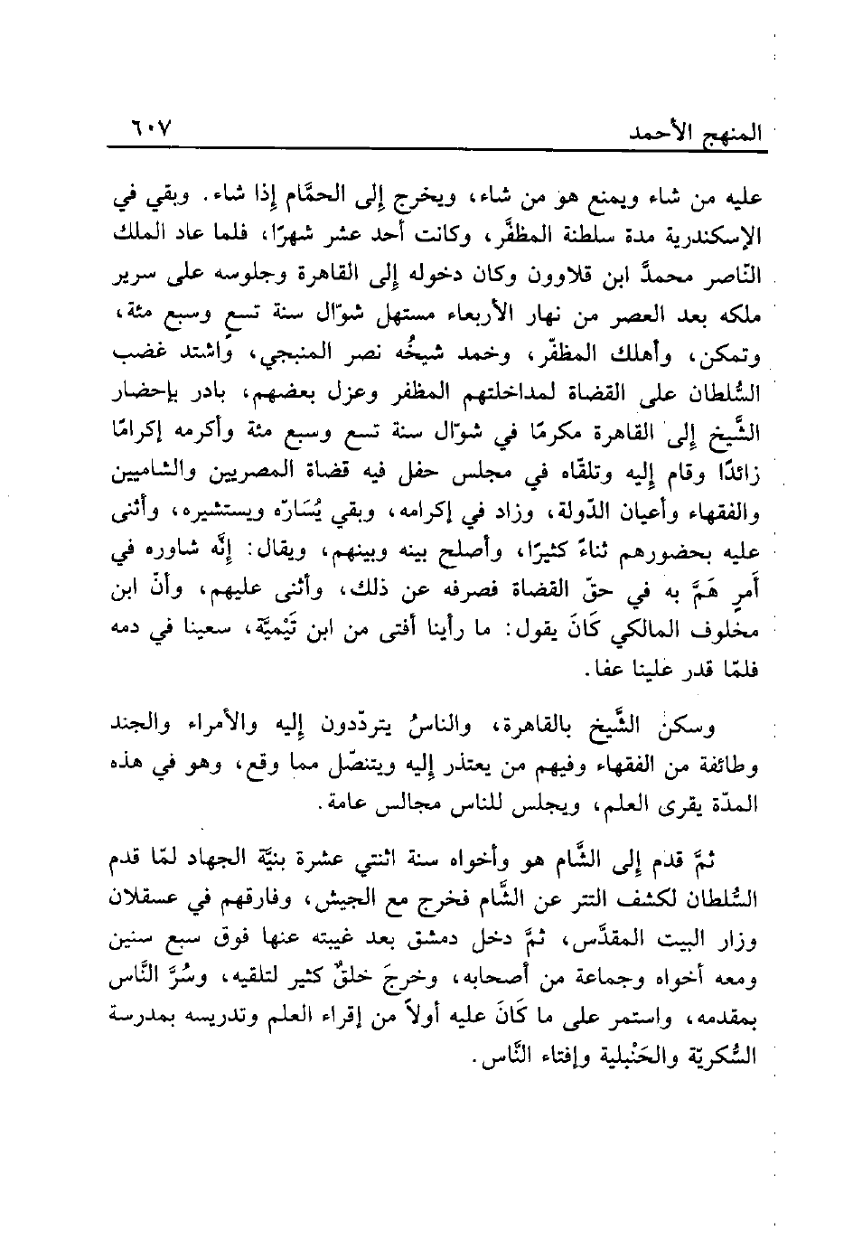 عليه من شاء ويمنع هو من شاء ويخرج إِلى الحمَّام إِذا شاء. وبقي في الإسكندرية مدة سلطنة المظفَّر، وكانت أحد عشر شهرًا، فلما عاد الملك النّاصر محمدَّ ابن قلاوون وكان دخوله إِلى القاهرة وجلوسه على سرير ملكه بعد العصر من نهار الأربعاء مستهل شوّال سنة تسعٍ وسبع مئة، وتمكن، وأهلك المظفّر، وخمد شيخُه نصر المنبجي، واشتد غضب السُّلطان على القضاة لمداخلتهم المظفر وعزل بعضهم، بادر بإحضار الشَّيخ إِلى القاهرة مكرمًا في شوّال سنة تسع وسبع مئة وأكرمه إكرامًا زائدًا وقام إِليه وتلقّاه في مجلس حفل فيه قضاة المصريين والشاميين والفقهاء وأعيان الدّولة، وزاد في إكرامه، وبقي يُسَارّه ويستشيره، وأثنى عليه بحضورهم ثناءً كثيرًا، وأصلح بينه وبينهم، ويقال: إِنَّه شاوره في أَمرٍ هَمَّ به في حقّ القضاة فصرفه عن ذلك، وأثنى عليهم، وأنّ ابن مخلوف المالكي كَانَ يقول: ما رأينا أفتى من ابن تَيْميَّة، سعينا في دمه فلمّا قدر علينا عفا.
