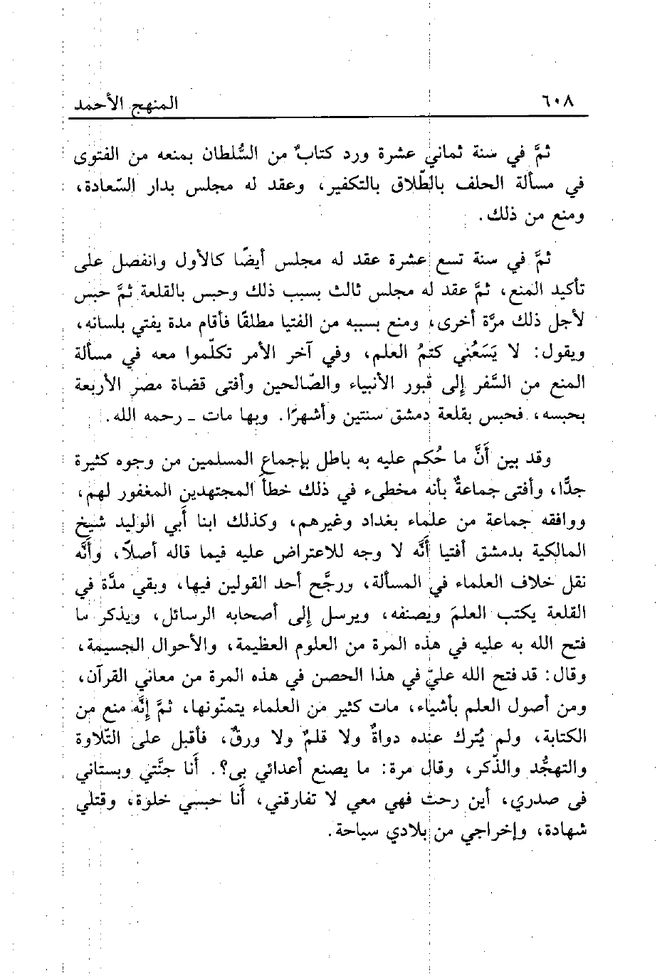 ثمَّ في سنة تسع عشرة عقد له مجلس أيضًا كالأول وانفصل على تأكيد المنع، ثمَّ عقد له مجلس ثالث بسبب ذلك وحبس بالقلعة ثمَّ حبس لأجل ذلك مرَّة أخرى، ومنع بسببه من الفتيا مطلقًا فأقام مدة يفتي بلسانه، ويقول: لا يَسَعُني كتمُ العلم، وفي آخر الأمر تكلّموا معه في مسألة المنع من السَّفر إِلى قبور الأنبياء والصّالحين وأفتى قضاة مصر الأربعة بحبسه، فحبس بقلعة دمشق سنتين وأشهرًا. وبها مات - رحمه الله.
