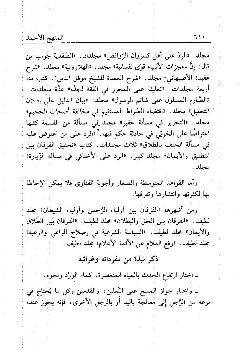 مجلد. «الرَدّ على أهل كسروان الرّوافض» مجلدان. «الصّفدية جواب من قال: إِنَّ معجزات الأنبياء قوّى نفسانية» مجلد. «الهلاوونية» مجلد. «شرح عقيدة الأصبهاني» مجلد. «شرح العمدة للشيخ موفق الدين». كتب منه أربعة مجلدات. «تعليقة على المحرر في الفقة لجدِّه» عدَّة مجلدات. «الصَّارم المسلول على شاتم الرسول» مجلد. «بيان الدليل على بطلان التحليل» مجلد. «اقتضاء الصّراط المستقيم في مخالفة أصحاب الجحيم» مجلد. «التحرير في مسألة حفير» مجلد في مسألة من القسمة كتبها اعتراضًا على الخويَي في حادثة حكم فيها. «الرد على من اعتراض عليه في مسألة الحلف بالطلاق» ثلاث مجلدات. كتاب «تحقيق الفرقان بين التطليق والأيمان» مجلد كبير. «الرد على الأَخنائي في مسألة الزّيارة» مجلد.