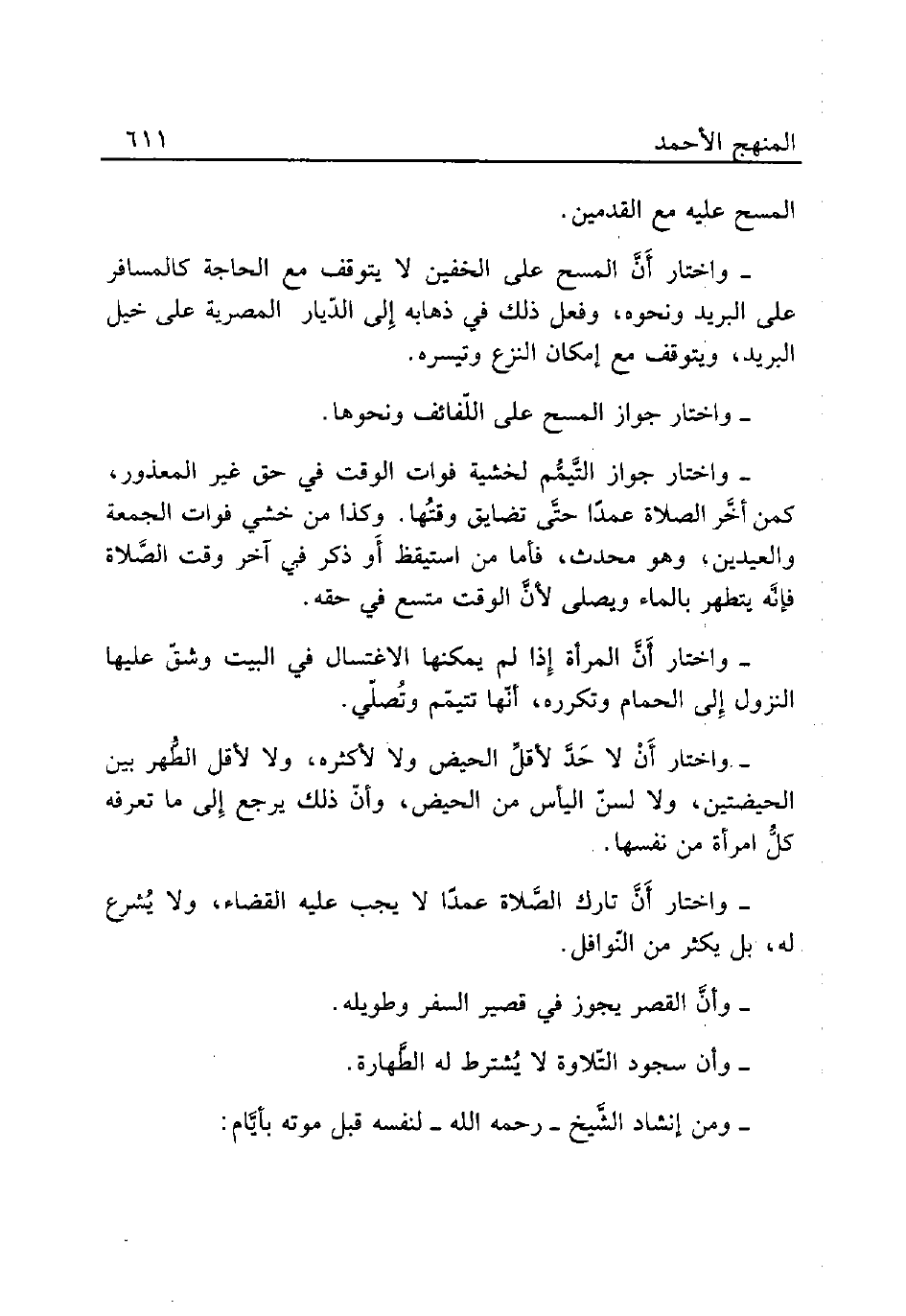 - واختار أَنَّ المسح على الخفين لا يتوقف مع الحاجة كالمسافر على البريد ونحوه، وفعل ذلك في ذهابه إِلى الدّيار المصرية على خيل البريد، ويتوقف مع إمكان النزع وتيسره.