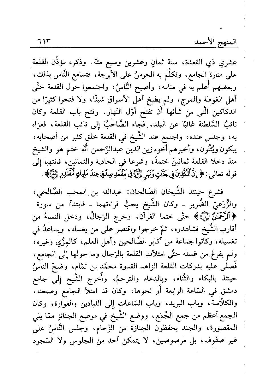 فشرع حينئذ الشََّيخان الصّالحان: عبد الله بن المحب الصَّالحي، والزُّرَعيّ الضَّرير - وكان الشَّيخ يحبُّ قراءتهما - فابتدأ من سورة {الرَّحْمَنُ (1)} حتَّى ختما القرآن، وخرج الرّجالُ، ودخل النساءُ من أقارب الشَّيخ فشاهدوه، ثمَّ خرجوا واقتصر على من يغسله، ويساعدُ في تغسيله، وكانوا جماعة من أكابر الصَّالحين وأهل العلم، كالمِزِّي وغيره، ولم يفرغ من غسله حتَّى امتلأت القلعة بالرّجال وما حولها إِلى الجامع، فَصلّى عليه بدركات القلعة الزاهد القدوة محمَّد بن تمَّام، وضجّ الناسُ حينئذ بالبكاء والثَّناء، وبالدعاء والترحمُّ، وأُخرج الشَّيخ إِلى جامع دمشق في السّاعة الرابعة أَو نحوها، وكان قد امتلأ الجامع وصحنه، والكلاّسة، وباب البريد، وباب السّاعات إِلى اللبادين والفوارة، وكان الجمع أعظم من جمع الجُمَع، ووضع الشَّيخ في موضع الجنائز ممّا يلي المقصورة، والجند يحفظون الجنازة من الزّحام، وجلس النَّاسُ على غير صفوف، بل مرصوصين، لا يتمكن أحمد من الجلوس ولا السّجود