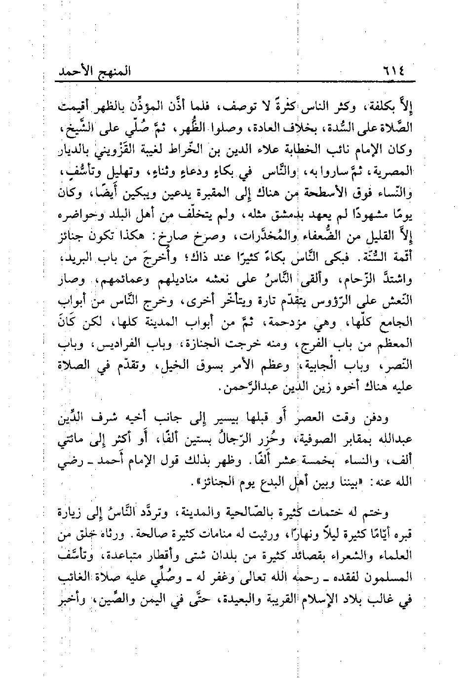 إِلاَّ بكلفة، وكثر الناس كثرةً لا توصف، فلما أذَّن المؤذِّن بالظهر أقيمت الصَّلاة علي السُّدة، بخلاف العادة، وصلوا الظُّهر، ثمَّ صُلّي على الشَّيخ، وكان الإمام نائب الخطابة علاء الدين بن الخّراط لغيبة القَزْويني بالديار المصرية، ثمَّ ساروا به، والنَّاس في بكاءٍ ودعاءٍ وثناءٍ، وتهليل وتأسُّفٍ، والنّساء فوق الأسطحة من هناك إِلى المقبرة يدعين ويبكين أَيضًا، وكان يومًا مشهودًا لم يعهد بدمشق مثله، ولم يتخلّف من أهل البلد وحواضره إِلاَّ القليل من الضُّعفاء والمُخدَّرات، وصرخ صارخ: هكذا تكون جنائز أئّمة السُّنّة. فبكى النَّاس بكاءً كثيرًا عند ذاك؛ وأُخرجَ من باب البريد، واشتدَّ الزّحام، وألقى النَّاسُ على نعشه مناديلهم وعمائمهم، وصار النّعش على الرّؤوس يتقدّم تارة ويتأخّر أخرى، وخرج النَّاس من أبواب الجامع كلّها، وهي مزدحمة، ثمَّ من أبواب المدينة كلها، لكن كَانَ المعظم من باب الفرج، ومنه خرجت الجنازة، وباب الفراديس، وباب النّصر، وباب الْجابية، وعظم الأمر بسوق الخيل، وتقدّم في الصلاة عليه هناك أخوه زين الدين عبد الرَّحمن.