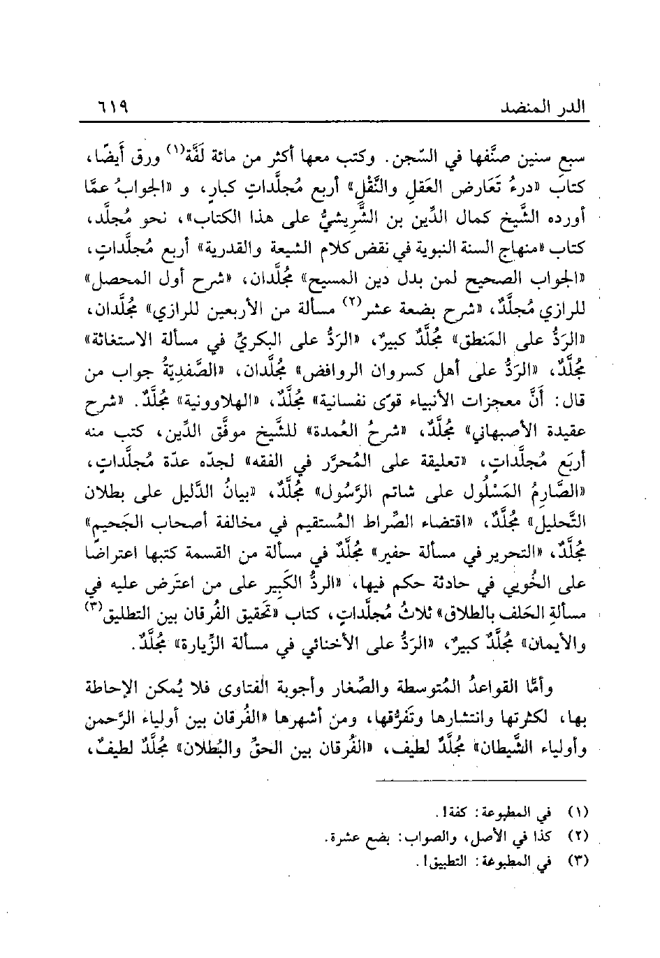 سبعِ سنين صنَّفها في السَّجن. وكتب معها أكثر من مائة لَفَّة (¬1) ورق أّيضًا، كتاب «درءُ تَعَارض العَقلِ والنَّقْلِ» أربع مُجلَّداتٍ كبارٍ، و «الجوابُ عمَّا أورده الشَّيخ كمال الدِّين بن الشَّرِيشيُّ على هذا الكتاب»، نحو مُجلَّد، كتاب «منهاج السنة النبوية في نقض كلام الشيعة والقدرية» أربع مُجلَّداتٍ، «الجواب الصحيح لمن بدل دين المسيح» مُجلَّدان، «شرح أول المحصل» للرازي مُجلَّدٌ، «شرح بضعة عشر (¬2) مسألة من الأربعين للرازي» مُجلَّدان، «الرّدُّ على المّنطق» مُجلَّدٌ كبيرٌ، «الرّدُّ على البكريِّ في مسألة الاستغاثة» مُجلَّدٌ، «الرَدُّ على أهل كسروان الروافض» مَجلَّدان، «الصَّفدِيّةُ جواب من قال: أّنَّ معجزات الأنبياء قوّى نفسانية» مُجلَّدٌ، «الهلاوونية» مُجلَّدٌ. «شرح عقيدة الأصبهاني» مُجلَّدٌ، «شرحُ العُمدة» للشَّيخ موفَّق الدِّين، كتب منه أربَع مُجلَّداتٍ، «تعليقة علي المُحرَّر في الفقه» لجدّه عدّة مُجلَّداتٍ، «الصَّارِمُ المَسْلُول على شاتم الرَّسٌول» مُجلَّدٌ، «بيانُ الدَّليل على بطلان التَّحليل» مُجلَّدٌ، «اقتضاء الصِّراط المُستقيم في مخالفة أصحاب الجَحيم» مُجلَّدٌ، «التحرير في مسألة حفير» مّجلَّدٌ في مسألة من القسمة كتبها اعتراضًا على الخُويي في حادثة حكم فيها، «الردُّ الكّبِير على من اعتَرض عليه في مسألةِ الحَلف بالطلاق» ثلاثُ مُجلدَّاتٍ، كتاب «تحّقيق الفُرقان بين التطليق (¬3) والأيمان» مَجلَّدٌ كبيرٌ، «الرّدُّ على الأخنائي في مسألة الزِّيارة» مُجلَّدٌ.