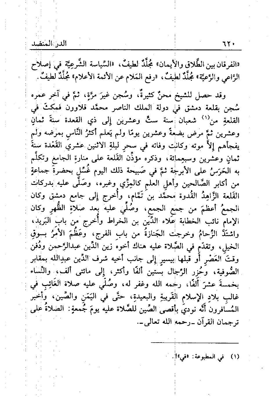 وقد حصل للشيخ محنٌ كثيرةٌ، وسُجن غيرَ مرَّةٍ، ثمَّ في آخر عمره سُجن بقلعة دمشق في دولة الملك الناصر محمَّد قلاوون فمكثَ في القلعةِ من (¬1) شعبان سنة ستٍّ وعشرين إِلى ذي القعدة سنةَ ثمانٍ وعشرين ثمَّ مرض بضعةً وعشرين يومًا ولم يَعلم أكثرُ النَّاسِ بمرضه ولم يفجأهم إِلاَّ موته وكانت وفاته في سحرِ ليلةِ الاثنين عشري القَعْدة سنةَ ثمان وعشرين وسبعِمائة، وذكره مؤذِّن القَلعة على منارةِ الجامعِ وتكلَّم به الحَرَسُ على الأبرجة ثمَّ في صَبيحة ذلك اليوم غُسِّل بحضرة جماعةٍ من أكابر الصَّالحين وأهلِ العلمِ كالمِزِّي وغيره، وصّلَّى عليه بدركات القَلعة الزَّاهِدُ القُدوة محمَّد بن تَمَّام، وأُخرج إِلى جامع دمشق وكان الجمعُ أعظمَ من جمع الجمعِ، وصُلِّي عليه بعد صلاةِ الظُّهرِ وكان الإمام نائب الخطابة عَلاء الدِّين بن الخراط وأُخرج من بابِ البَريد، واشتَدَّ الزِّحامُ وخرجت الجَنازةُ من بابِ الفرج، وعَظُمَ الأَمرُ بسوقِ الخيلِ، وتقدّم في الصَّلاة عليه هناك أخوه زين الدِّين عبد الرَّحمن ودُفن وقت العَصْرِ أَو قبلها بيسيرٍ إِلى جانب أخيه شرف الدِّين عبدِالله بمقابر الصُّوفية، وحُزِر الرِّجال بستين ألفًا وأكثر، إِلى مائتي ألف، والنِّساء بخمسةَ عشرَ ألفًا، رحمه الله وغفر له، وصٌلّي عليه صلاة الغَائِبِ في غالبِ بلادِ الإسلامِ القَريبةِ والبعيدةِ، حتَّى في اليَمَنِ والصِّين، وأخبر المُسافرون أَنَّه نودي بأقصى الصِّين للصَّلاة عليه يومَ جُمعةٍ: الصلاةُ على ترجمان القرآن - رحمه الله تعالى -.