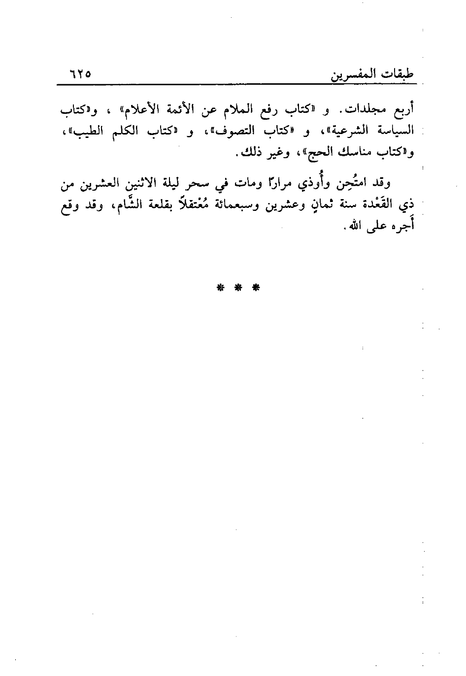 أربع مجلدات. و «كتاب رفع الملام عن الأئمة الأعلام»، و «كتاب السياسة الشرعية»، و «كتاب التصوف»، و «كتاب الكلم الطيب»، و «كتاب مناسك الحج»، وغير ذلك.