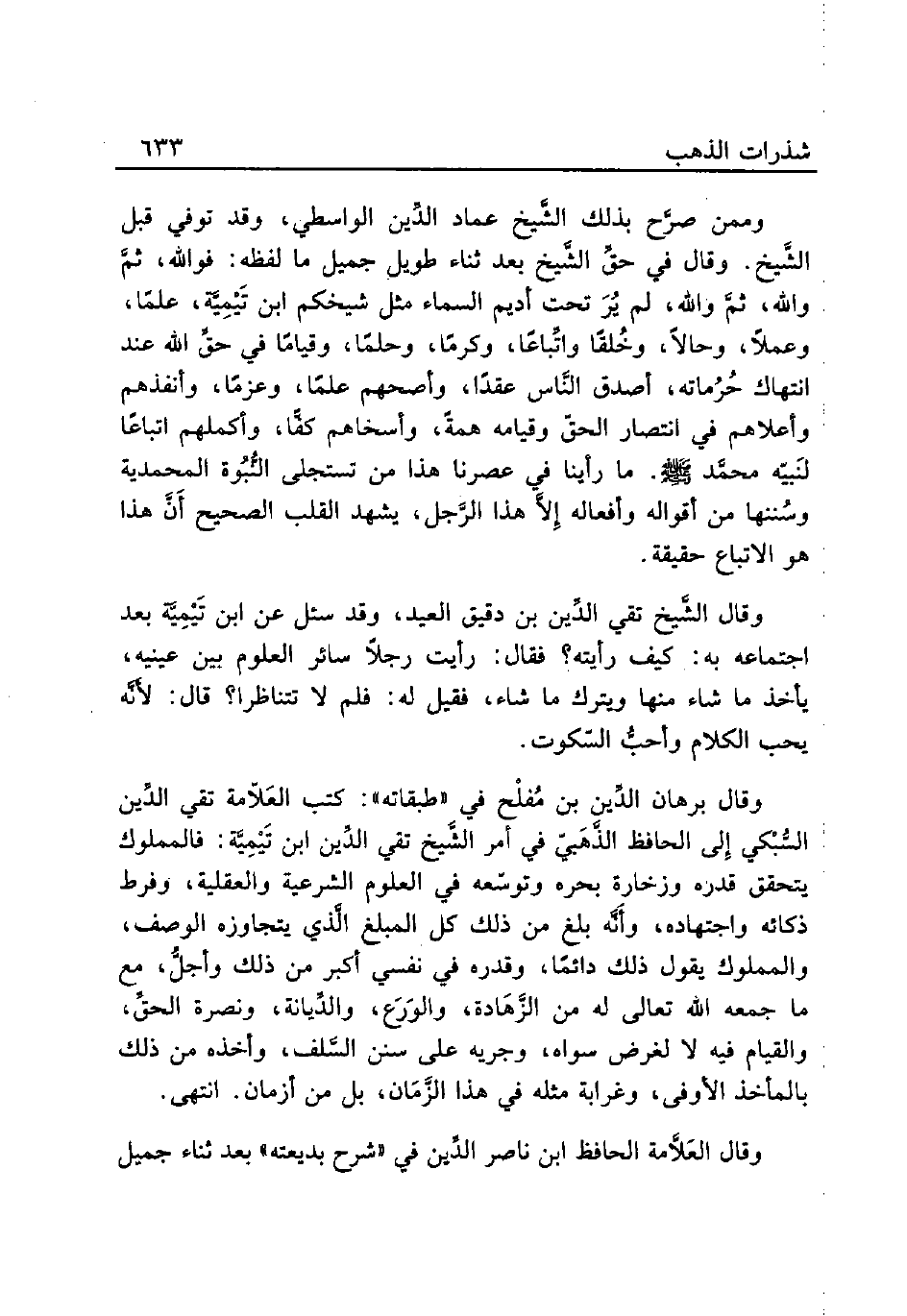 وممن صرَّح بذلك الشَّيخ عماد الديِّن الواسطي، وقد توفي قبل الشَّيخ. وقال في حقِّ الشَّيخ بعد ثناء طويل جميل ما لفظه: فوالله، ثمَّ والله، ثمَّ والله، لم يُرَ تحت أديم السماء مثل شيخكم ابن تَيْمِيَّة، علمًا، وعملاً، وحالاً، وخُلقًا واتِّباعًا، وكرمًا، وحلمًا، وقيامًا في حقِّ الله عند انتهاك حُرُماته، أصدق النَّاس عقدًا، وأصحهم علمًا، وعزمًا، وأنفذهم وأعلاهم في انتصار الحقّ وقيامه همةً، وأسخاهم كفَّا، وأكملهم اتباعًا لنَبيّه محمَّد صلي الله عليه وسلم. ما رأينا في عصرنا هذا من تستجلى النُّبُوة المحمدية وسُننها من أقواله وأفعاله إِلاَّ هذا الرَّجل، يشهد القلب الصحيح أَنَّ هذا هو الاتباع حقيقة.