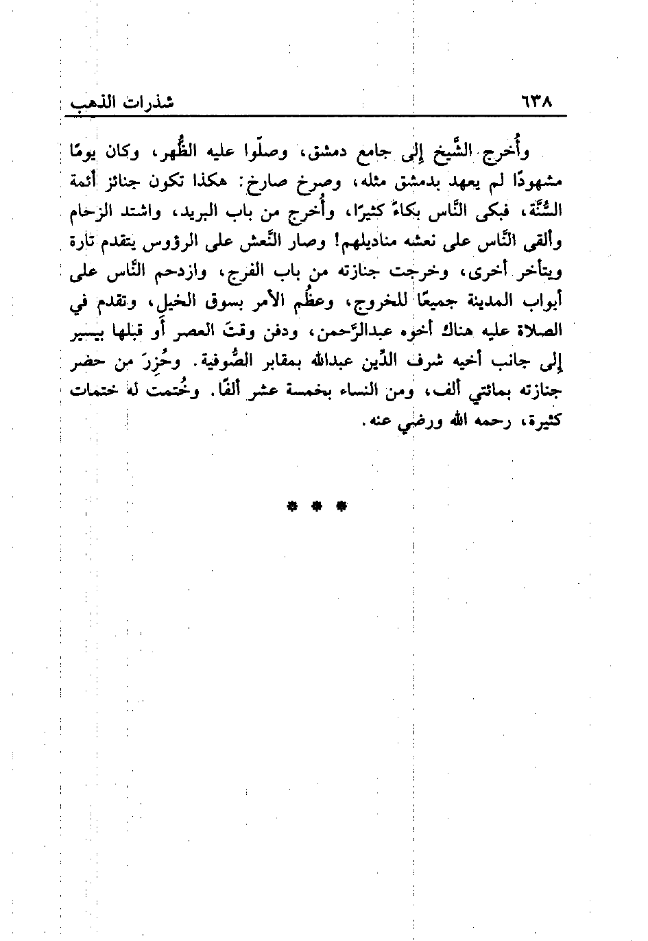 وأُخرج الشَّيخ إِلى جامع دمشق، وصلّوا عليه الظُّهر، وكان يومًا مشهودًا لم يعهد بدمشق مثله، وصرخ صارخ: هكذا تكون جنائز أئمة السُّنَّة، فبكى النَّاس بكاءً كثيرًا، وأُخرج من باب البريد، واشتد الزحام وألقى النَّاس علة نعشه مناديلهم! وصار النَّعش على الرؤوس يتقدم تارة ويتأخر أخرى، وخرجت جنازته من باب الفرج، وازدحم النًّاس على أبواب المدينة جميعًا للخروج، وعظُم الأمر بسوق الخيلِ، وتقدم في الصلاة عليه هناك أخوه عبد الرَّحمن، ودفن وقتَ العصر أَو قبلها بيسير إِلى جانب أخيه شرف الدِّين عبد الله بمقابر الصُّوفية. وحُزِرَ من حضر جنازته بمائتي ألف، ومن النساء بخمسة عشر ألفًا. وخُتمت له ختمات كثيرة، رحمه الله ورضي عنه.