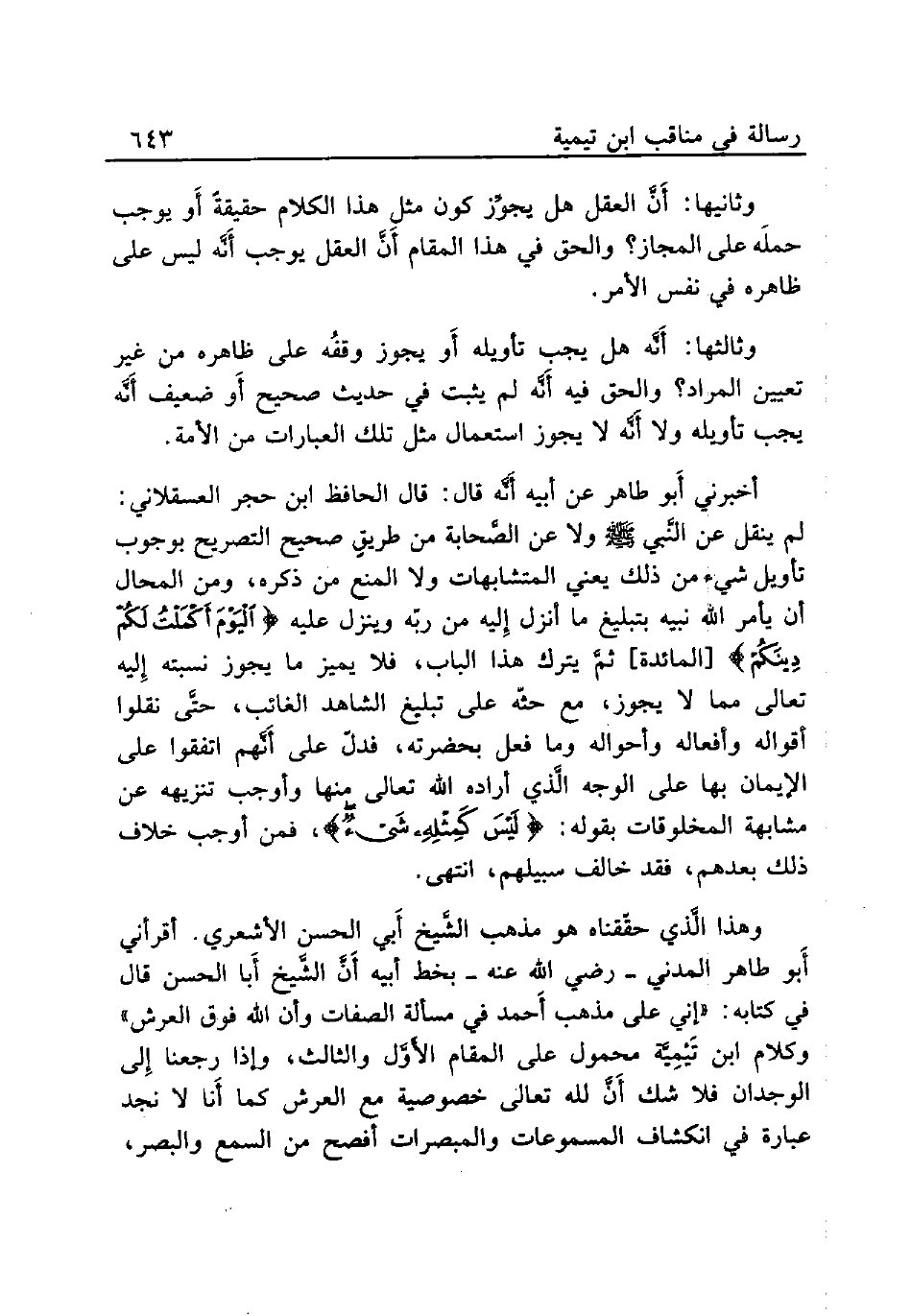 وهذا الَّذي حقّقناه هو مذهب الشَّيخ أَبي الحسن الأشعري. أقرأني أَبو طاهر المدني - رضي الله عنه - بخط أبيه أّنَّ الشَّيخ أّبا الحسن قال في كتابه: «إني علي مذهب أَحمد في مسألة الصفات وأن الله فوق العرش» وكلام ابن تَيْمِيَّة محمول على المقام الأوَّل والثالث، وإذا رجعنا إِلى الوجدان فلا شك أّنَّ لله تعالى خصوصية مع العرش كما أَنا لا نجد عبارة في انكشاف المسموعات والمبصرات أفصح من السمع والبصر،