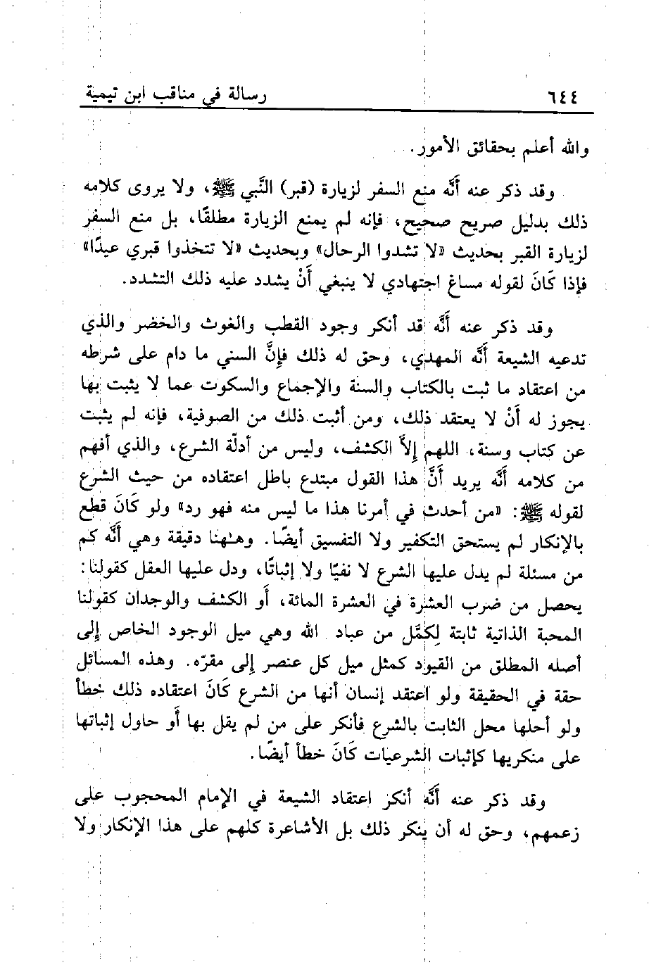 وقد ذكر عنه أّنَّه منع السفر لزيارة (قبر) النَّبي صلى الله عليه وسلم، ولا يروى كلامه ذلك بدليل صريح صحيح، فإنه لم يمنع الزيارة مطلقًا، بل منع السفر لزيارة القبر بحديث «لا تشدوا الرحال» وبحديث «لا تتخذوا قبري عيدًا» فإذا كَانَ لقوله مساغ اجتهادي لا ينبغي أّنْ يشدد عليه ذلك التشدد.