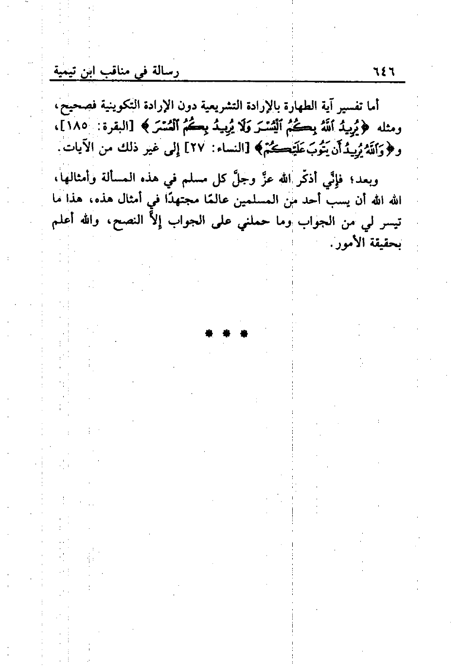 أما تفسير آية الطهارة بالإرادة التشريعية دون الإرادة التكوينية فصحيح، ومثله {يُرِيدُ اللَّهُ بِكُمُ الْيُسْرَ وَلَا يُرِيدُ بِكُمُ الْعُسْرَ} [البقرة: 185]، و {وَاللَّهُ يُرِيدُ أَنْ يَتُوبَ عَلَيْكُمْ} [النساء: 27] إِلى غير ذلك من الآيات.