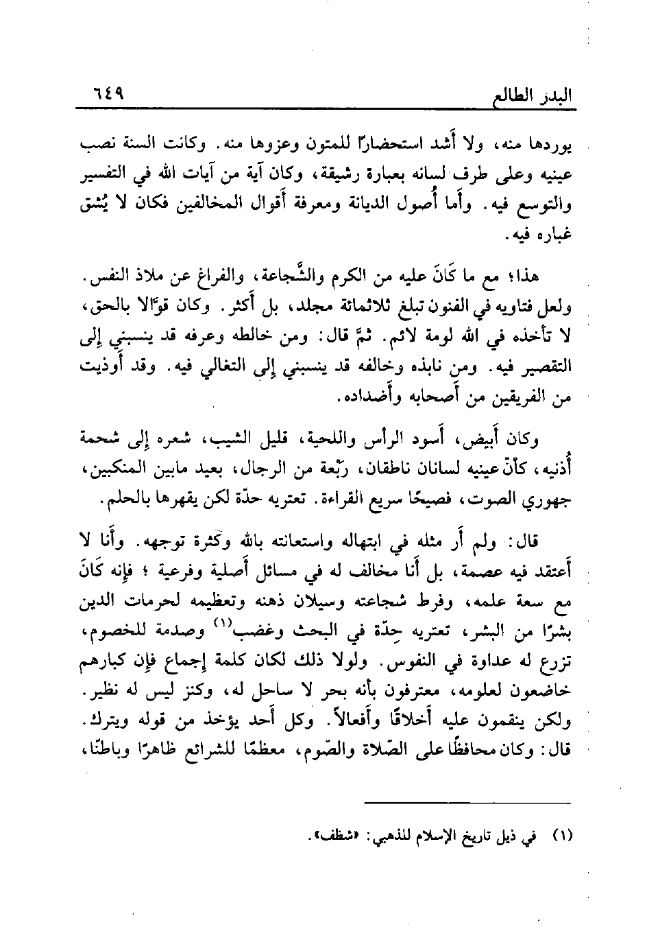 قال: ولم أَر مثله في ابتهاله واستعانته بالله وكثرة توجهه. وأَنا لا أَعتقد فيه عصمة، بل أَنا مخالف له في مسائل أَصلية وفرعية؛ فإِنه كَانَ مع سعة علمه، وفرط شجاعته وسيلان ذهنه وتعظيمه لحرمات الدين بشرًا من البشر، تعتريه حِدّة في البحث وغضب (¬1) وصدمة للخصوم، تزرع له عداوة في النفوس. ولولا ذلك لكان كلمة إِجماع فإِن كبارهم خاضعون لعلومه، معترفون بأنه بحر لا ساحل له، وكنز ليس له نظير. ولكن ينقمون عليه أَخلاقًا وأَفعالاً. وكل أَحد يؤخذ من قوله ويترك. قال: وكان محافظًا على الصّلاة والصّوم، معظمًا للشرائع ظاهرًا وباطنًا.