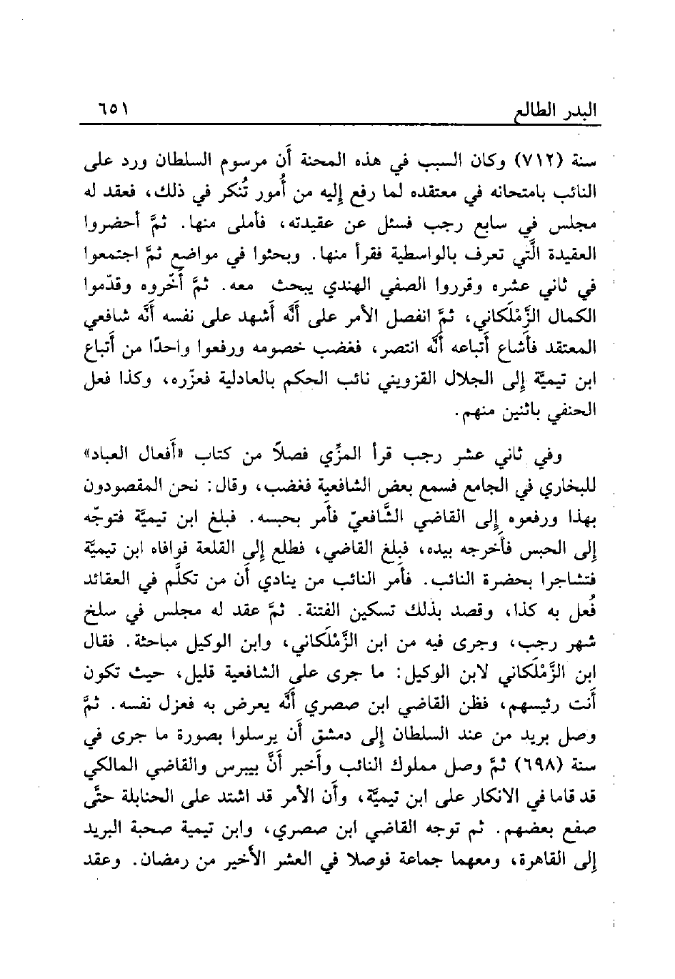 وفي ثاني عشر رجب قرأ المزِّي فصلاً من كتاب «أَفعال العباد» للبخاري في الجامع فسمع بعض الشافعية فغضب، وقال: نحن المقصودون بهذا ورفعوه إِلي القاضي الشَّافعيّ فأَمر بحبسه. فبلغ ابن تيميَّة فتوجّه إِلى الحبس فأَخرجه بيده، فبلغ القاضي، فطلع إِلى القلعة فوافاه ابن تيميَّة فتشاجرا بحضرة النائب. فأَمر النائب من ينادي أَن من تكلَّم في العقائد فُعل به كذا، وقصد بذلك تسكين الفتنة. ثمَّ عقد له مجلس في سلخ شهر رجب، وجرى فيه من ابن الزَّمْلَكاني، وابن الوكيل مباحثة. فقال ابن الزَّمْلَكاني لابن الوكيل: ما جرى على الشافعية قليل، حيث تكون أَنت رئيسهم، فظن القاضي ابن صصري أَنَّه يعرض به فعزل نفسه. ثمَّ وصل بريد من عند السلطان إِلى دمشق أَن يرسلوا بصورة ما جرى في سنة (698) ثمَّ وصل مملوك النائب وأَخبر أَنَّ بيبرس والقاضي المالكي قد قاما في الانكار على ابن تيميَّة، وأَن الأمر قد اشتد على الحنابلة حتَّى صفع بعضهم. ثم توجه القاضي ابن صصري، وابن تيمية صحبة البريد إِلى القاهرة، ومعهما جماعة فوصلا في العشر الأخير من رمضان. وعقد