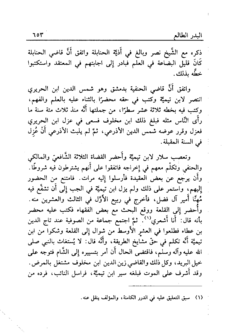 وتعصب سلار لابن تيميَّة وأَحضر القضاة الثلاثة الشَّافعيّ والمالكي والحنفي وتكلّم معهم في إِخراجه فاتفقوا على أَنهم يشترطون فيه شروطًا. وأَن يرجع عن بعض العقيدة فأرسلوا إِليه مرات. فامتنع من الحضور إِليهم، واستمر على ذلك ولم يزل ابن تيميَّة في الجب إِلى أَن تشفَّع فيه مُهنَّا أَمير آل فضل، فأخرج في ربيع الأوَّل في الثالث والعشرين منه. وأُحضر إِلى القلعة ووقع البحث مع بعض الفقهاء فكتب عليه محضر بأنه قال: أَنا أَشعري (¬1). ثمَّ اجتمع جماعة من الصوفية عند تاج الدين بن عطاء فطلعوا في العشر الأَوسط من شوال إِلى القلعة وشكوا من ابن تيميَّة أَنَّه تكلم في حق مشايخ الطريقة، وأَنَّه قال: لا يُستغاث بالنبي صلى الله عليه وآله وسلم، فاقتضى الحال أَن أمر بتسييره إِلى الشَّام فتوجه على خيل البريد، وكل ذلك والقاضي زين الدين ابن مخلوف مشتغل بالمرض. وقد أَشرف على الموت فبلغه سير ابن تيميًّة، فراسل النائب، فرده من