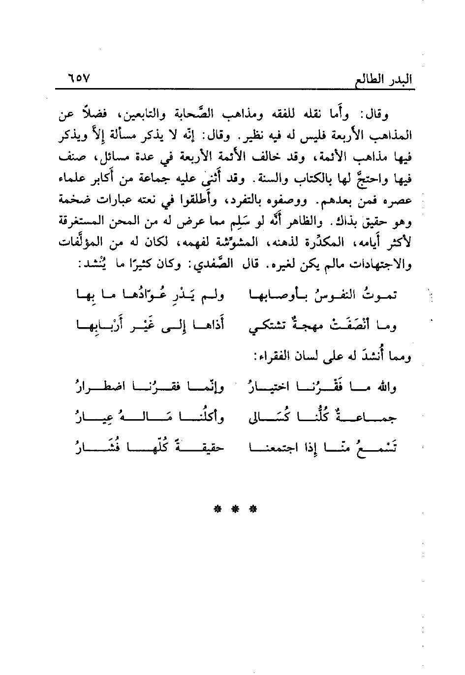 وقال: وأَما نقله للفقه ومذاهب الصَّحابة والتابعين، فضلاً عن المذاهب الأَربعة فليس له نظير. وقال: إنّه لا يذكر مسألة إِلاَّ ويذكر فيها مذاهب الأئمة، وقد خالف الأَئمة الأربعة في عدة مسائل، صنف فيها واحتجَّ لها بالكتاب والسنة. وقد أَثنى عليه جماعة من أَكابر علماء عصره فمن بعدهم. ووصفوه بالتفرد، وأَطلقوا في نعته عبارات ضخمة وهو حقيق بذاك. والظاهر أَنَّه لو سَلِم مما عرض له من المحن المستغرقة لأكثر أَيامه، المكدِّرة لذهنه، المشوِّشة لفهمه، لكان من المؤلَّفات والاجتهادات مالم يكن لغيره. قال الصَّفدي: وكان كثيرًا ما يُنْشد: