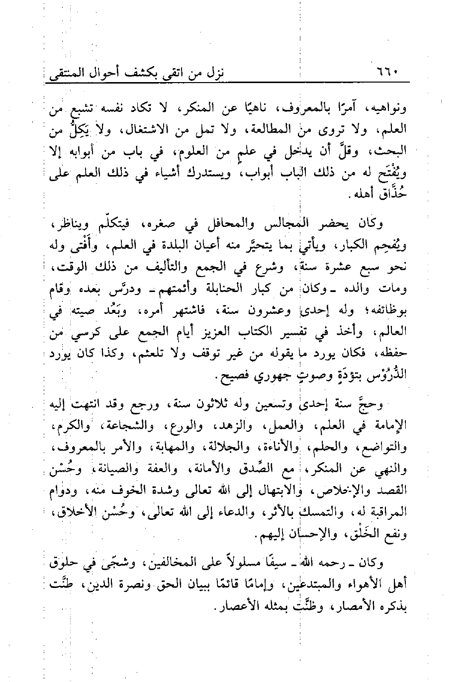 وكان ـ رحمه الله ـ سيفًا مسلولاً على المخالفين، وشجًى في حلوق أهل الأهواء والمبتدعين، وإمامًا قائمًا ببيان الحق ونصرة الدين، طنَّت بذكره الأمصار، وظنَّت بمثله الأعصار.