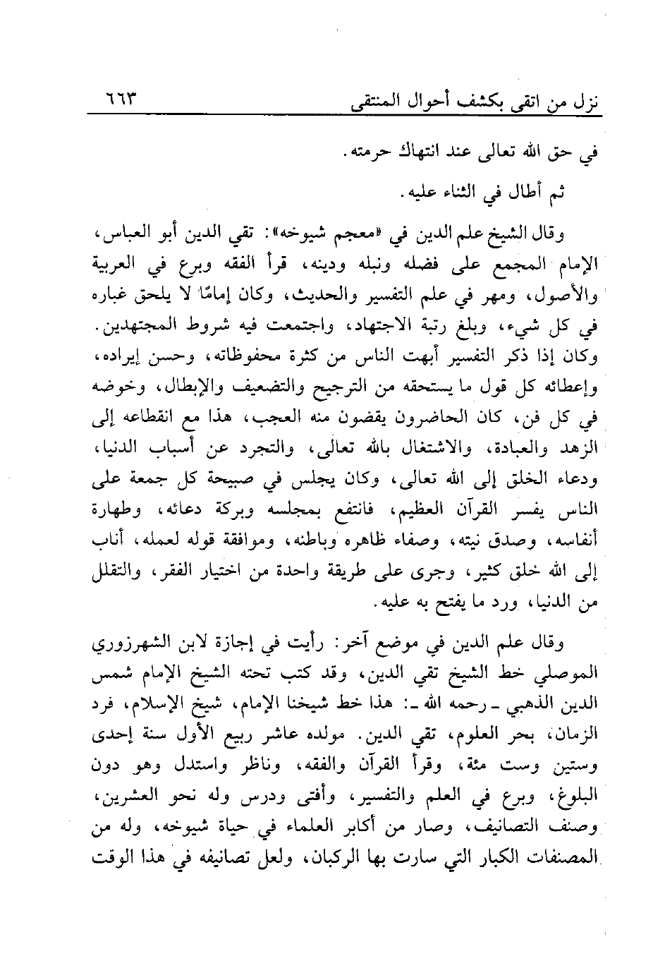 وقال الشيخ علم الدين في «معجم شيوخه»: تقي الدين أبو العباس، الإمام المجمع على فضله ونبله ودينه، قرأ الفقه وبرع في العربية والأصول، ومهر في علم التفسير والحديث، وكان إمامًا لا يلحق غباره في كل شيء، وبلغ رتبة الاجتهاد، واجتمعت فيه شروط المجتهدين. وكان إذا ذكر التفسير أبهت الناس من كثرة محفوظاته، وحسن إيراده، وإعطائه كل قول ما يستحقه من الترجيح والتضعيف والإبطال، وخوضه في كل فن، كان الحاضرون يقضون منه العجب، هذا مع انقطاعه إلى الزهد والعبادة، والاشتغال بالله تعالى، والتجرد عن أسباب الدنيا، ودعاء الخلق إلى الله تعالى، وكان يجلس في صبيحة كل جمعة على الناس يفسر القرآن العظيم، فانتفع بمجلسه وبركة دعائه، وطهارة أنفاسه، وصدق نيته، وصفاء ظاهره وباطنه، وموافقة قوله لعمله، أناب إلى الله خلق كثير، وجرى على طريقة واحدة من اختيار الفقر، والتقلل من الدنيا، ورد ما يفتح به عليه.