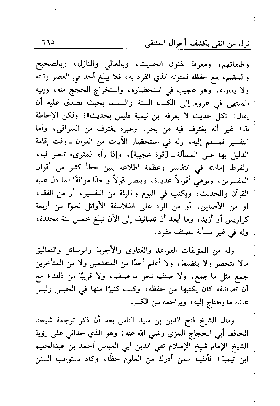 وطبقاتهم، ومعرفة بفنون الحديث، وبالعالي والنازل، وبالصحيح والسيقم، مع حفظه لمتونه الذي انفرد به، فلا يبلغ أحد في العصر رتبته ولا يقاربه، وهو عجيب في استحضاره، واستخراج الحجج منه، وإليه المنتهى في عزوه إلى الكتب الستة والمسند بحيث يصدق عليه أن يقال: «كل حديث لا يعرفه ابن تيمية فليس بحديث»؛ ولكن الإحاطه لله؛ غير أنه يغترف فيه من بحر، وغيره يغترف من السواقي، وأما التفسير فمسلم إليه، وله في استحضار الآيات من القرآن ـ وقت إقامة الدليل بها على المسألة ـ[قوة عجيبة]، وإذا رآه المقرئ تحير فيه، ولفرط إمامته في التفسير وعظمة اطلاعه يبين خطأ كثير من أقول المفسرين، ويوهي أقوالاً عديدة، وينصر قولاً واحدًا لما دل عليه القرآن والحديث، ويكتب في اليوم والليلة من التفسير، أو من الفقه، أو من الأصلين، أو من الرد على الفلاسفة الأوائل نحوًا من أربعة كراريس أو أزيد، وما أبعد تصانيفه إلى الآن تبلغ خمس مئة مجلدة، وله في غير مسألة مصنف مفرد.