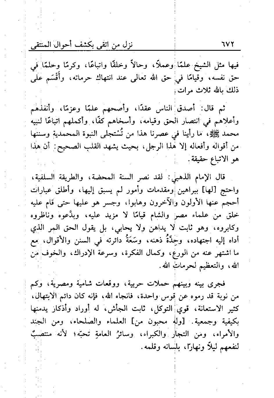 ثم قال: أصدق الناس عقدًا وأصحهم علمًا وعزمًا، وأنفذهم وأعلاهم في انتصار الحق وقيامه، وأسخاهم كفًا، وأكملهم اتباعًا لنبيه محمد صلي الله عليه وسلم، ما رأينا في عصرنا هذا من تُسْتجلى النبوة المحمدية وسننها من أقواله وأفعاله إلا هذا الرجل، بحيث يشهد القلب الصحيح: أن هذا هو الاتباع حقيقة.