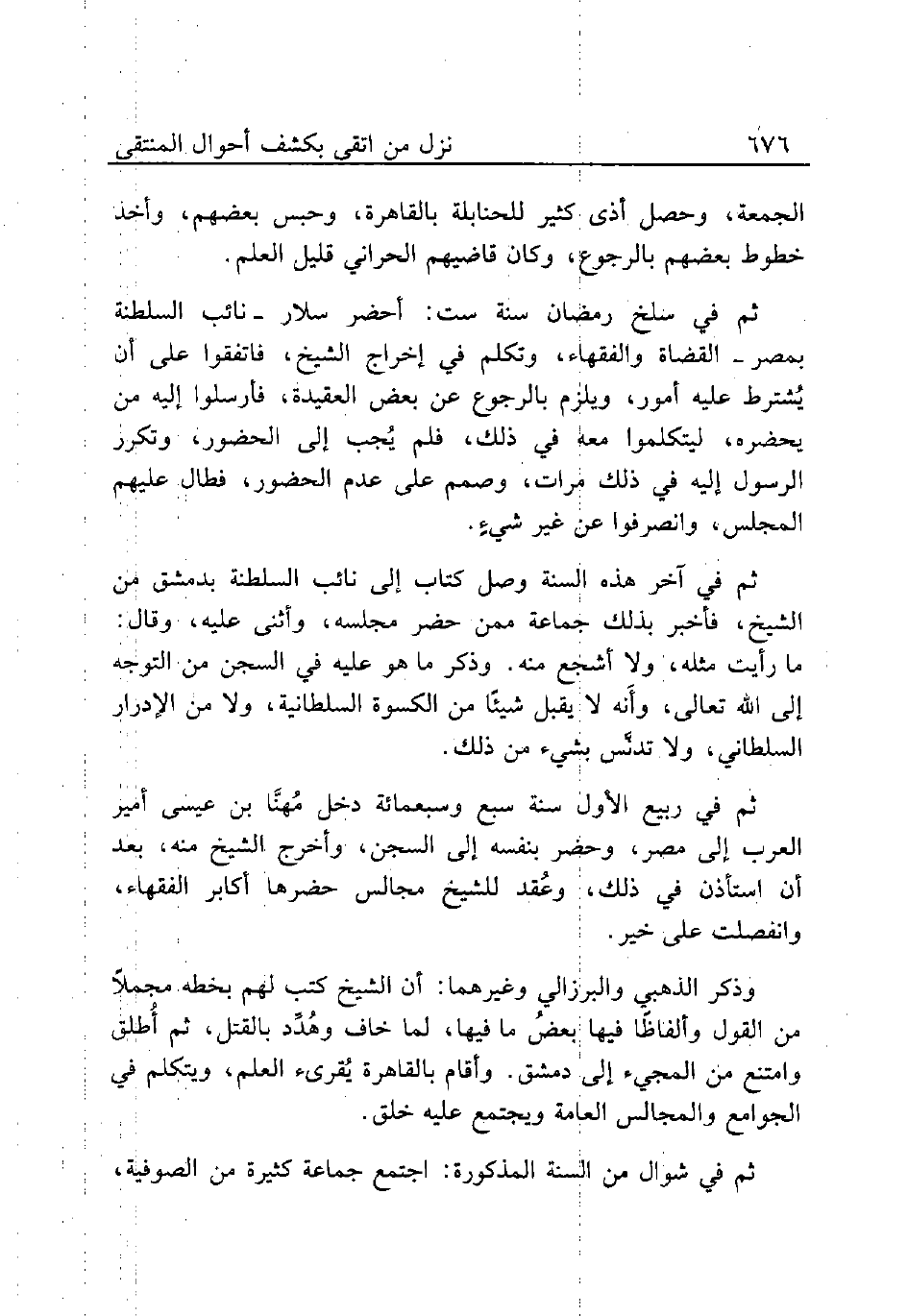 ثم في آخر هذه السنة وصل كتاب نائب السلطنة بدمشق من الشيخ، فأخبر بذلك جماعة ممن حضر مجلسه، وأثنى عليه، وقال: ما رأيت مثله، ولا أشجع منه. وذكر ما هو عليه في السجن من التوجه إلى الله تعالى، وأَنه لا يقبل شيئًا من الكسوة السلطانية، ولا من الإدرار السلطاني، ولا تدنَّس بشيء من ذلك.