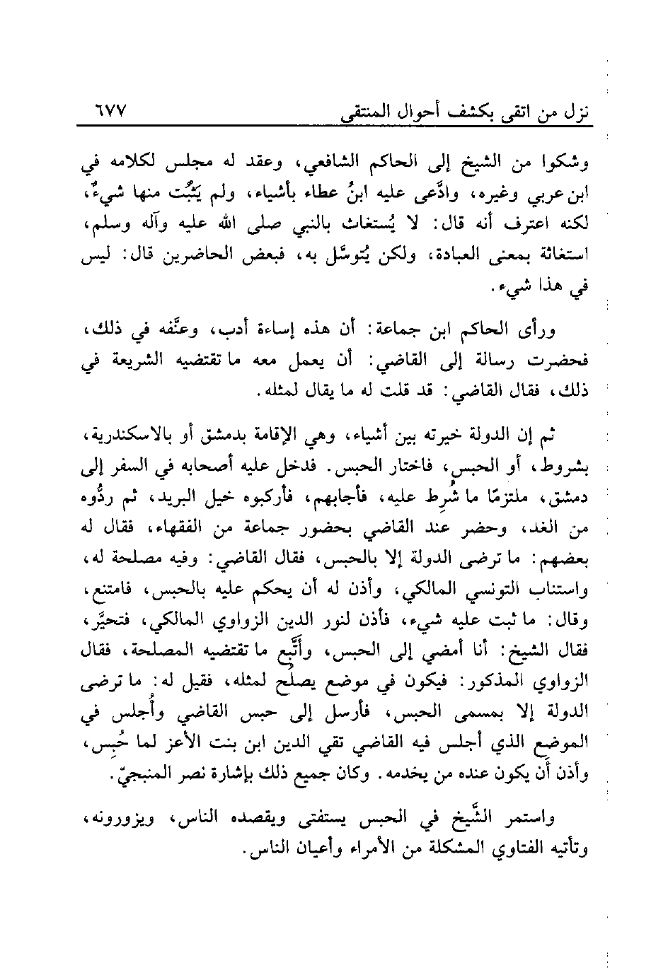 ثم إن الدولة خيرته بين أشياء، وهي الإقامة بدمشق أو بالاسكندرية، بشروط، أو الحبس، فاختار الحبس. فدخل عليه أصحابه في السفر إلى دمشق، ملتزمًا ما شُرِط عليه، فأجابهم، فأركبوه خيل البريد، ثم ردُّوه من الغد، وحضر عند القاضي بحضور جماعة من الفقهاء، فقال له بعضهم: ما ترضى الدولة إلا بالحبس، فقال القاضي: وفيه مصلحة له، واستناب التونسي المالكي، وأذن له أن يحكم عليه بالحبس، فامتنع، وقال: ما ثبت عليه شيء، فأذن لنور الدين الزواوي المالكي، فتحيَّر، فقال الشيخ: أنا أمضي إلى الحبس، وأَتَّبع ما تقتضيه المصلحة، فقال الزواوي المذكور: فيكون في موضع يصلُح لمثله، فقيل له: ما ترضى الدولة إلا بمسمى الحبس، فأرسل إلى حبس القاضي وأُجلس في الموضع الذي أجلس فيه القاضي تقي الدين ابن بنت الأعز لما حُبِس، وأذن أَن يكون عنده من يخدمه. وكان جميع ذلك بإشارة نصر المنبجيّ.