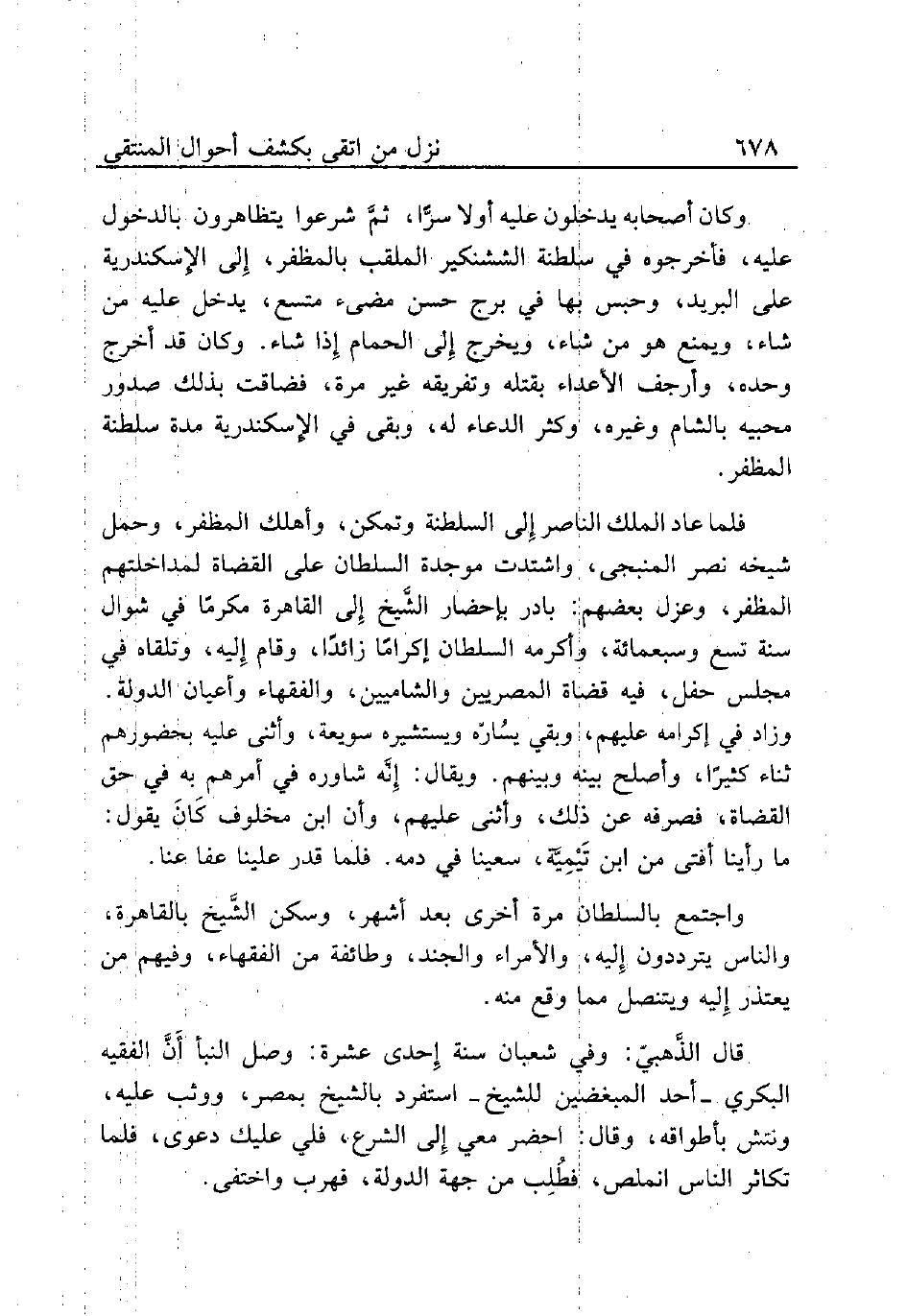 واجتمع بالسلطان مرة أخرى بعد أشهر، وسكن الشَّيخ بالقاهرة، والناس يترددون إِليه، والأمراء والجند، وطائفة من الفقهاء، وفيهم من يعتذر إِليه ويتنصل مما وقع منه.