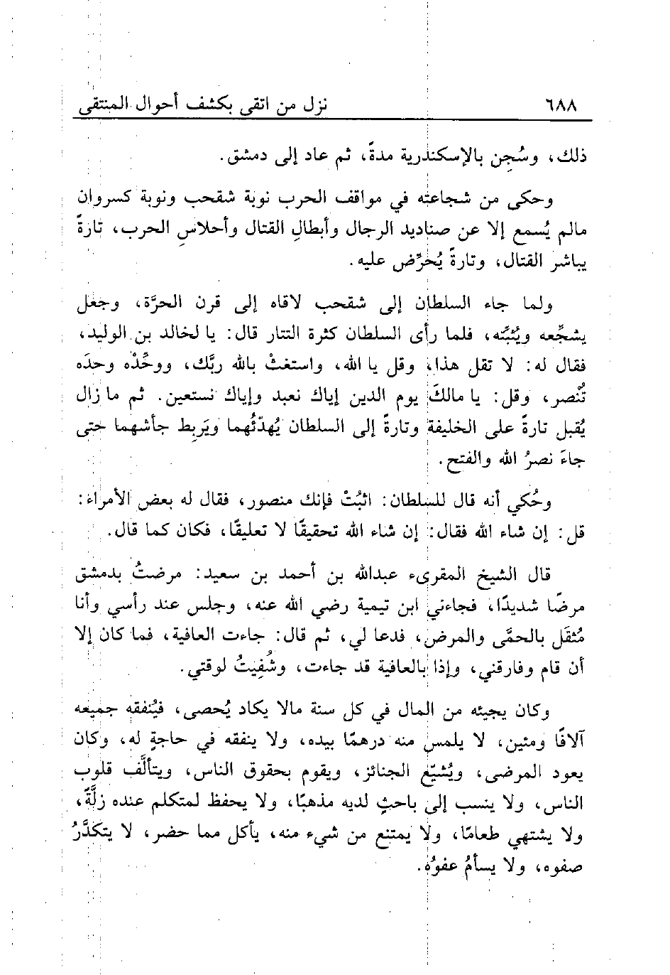 ولما جاء السلطان إلى شقحب لاقاه إلى قرن الحرَّة، وجعل يشجِّعه ويُثبِّته، فلما رأى السلطان كثرة التتار قال: يا لخالد بن الوليد فقال له: لا تقل هذا، وقل يا الله، واستغثْ بالله ربَّك، ووحِّدْه وحدَه تُنْصر، وقل: يا مالكَ يوم الدين إياك نستعين. ثم ما زال يُقبل تارةً إلى السلطان يُهدّئُهما ويَربِط جأشهما حتى جاءَ نصرُ الله والفتح.