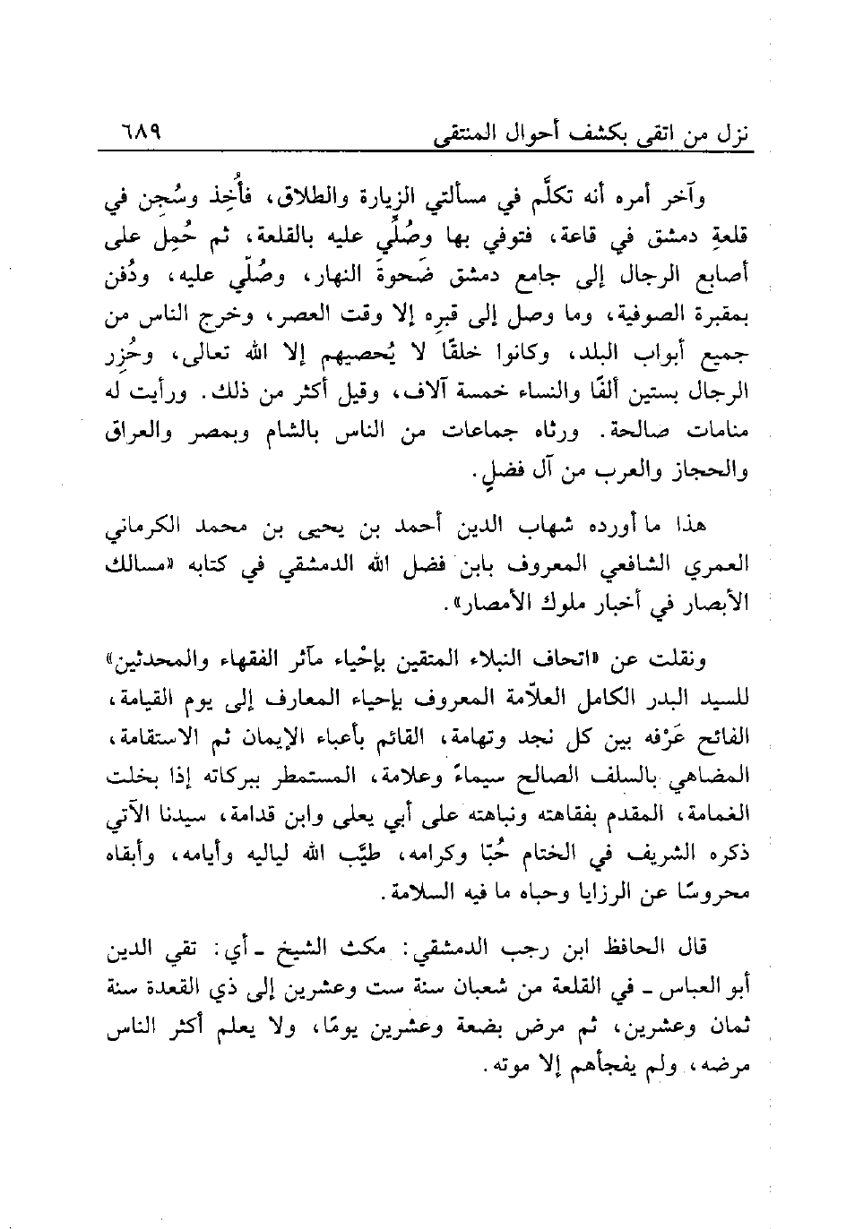 وآخر أمره أنه تكلَّم في مسألتي الزيارة والطلاق، فأُخِذ وسُجِن في قلعةِ دمشق في قاعة، فتوفي بها وصُلِّي عليه بالقلعة، ثم حُمِل على أصابع الرجال إلى جامع دمشق ضَحوةَ النهار، وصُلّي عليه، ودُفن بمقبرة الصوفية، وما وصل إلى قبرِه إلا وقت العصر، وخرج الناس من جميع أبواب البلد، وكانوا خلقًا لا يُحصيهم إلا الله تعال، وحُزِر الرجال بستين ألفًا والنساء خمسة لآلف، وقيل أكثر من ذلك. ورأيت له منامات صالحة. ورثاه جماعات من الناس بالشام وبمصر والعراق والحجاز والعرب من آل فضلٍ.