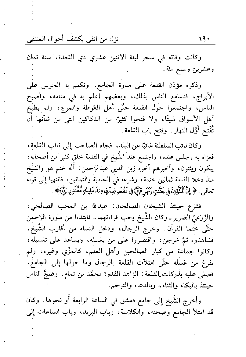 وكان نائب السلطنة غائبًا عن البلد، فجاء الصاحب إِلى نائب القلعة، فعزاه به وجلس عنده، واجتمع عند الشَّيخ في القلعة خلق كثير من أصحابه، يبكون ويثنون، وأخبرهم أخوه زين الدين عبد الرَّحمن: أَنَّه ختم هو والشيخ منذ دخلا القلعة ثمانين ختمة، وشرعا في الحادية والثمانين، فانتهيا إِلى قوله تعالى: {إِنَّ الْمُتَّقِينَ فِي جَنَّاتٍ وَنَهَرٍ (54) فِي مَقْعَدِ صِدْقٍ عِنْدَ مَلِيكٍ مُقْتَدِرٍ (55)}.