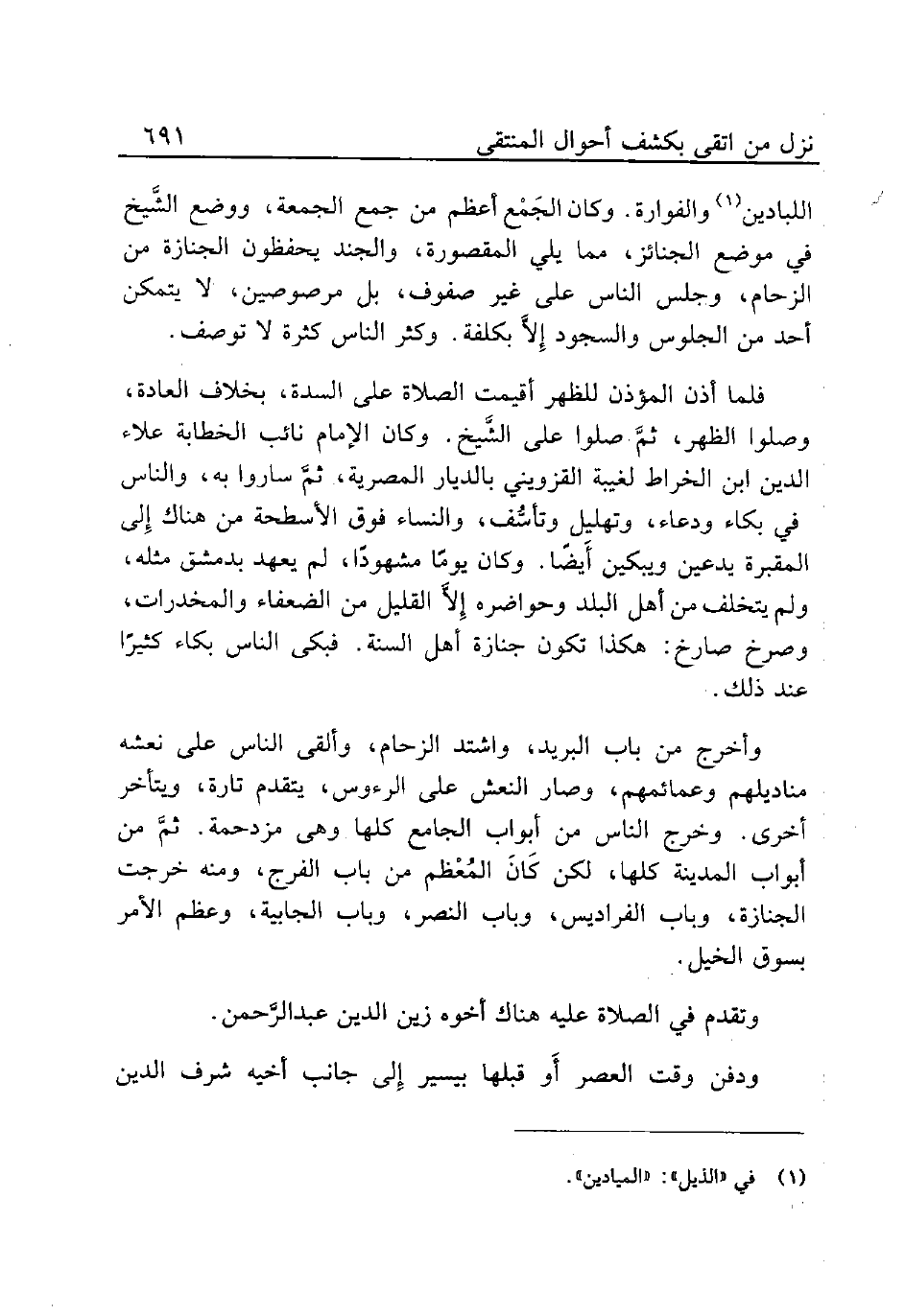 اللبادين (¬1) والفوارة. وكان الجَمْع أعظم من جمع الجمعة، ووضع الشَّيخ في موضع الجنائز، مما يلي المقصورة والجند يحفظون الجنازة من الزحام، وجلس الناس على غير صفوف، بل مرصوصين، لا يتمكن أحد من الجلوس والسجود إِلاَّ بكلفة. وكثر الناس كثرة لا توصف.