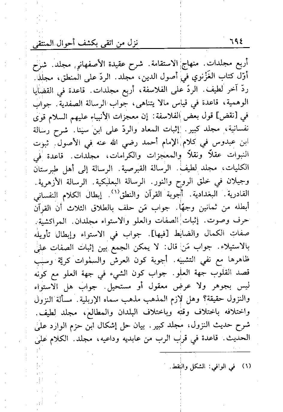 أربع مجلدات. منهاج الاستقامة. شرح عقيدة الأصفهاني مجلد. شرح أوّل كتاب الغَزْنوي في أصول الدين، مجلد. الردّ على المنطق، مجلد. ردّ آخر لطيف. الردّ على الفلاسفة، أربع مجلدات. قاعدة في القضايا الوهمية، قاعدة في قياس مالا يتناهى، جواب الرسالة الصفدية. جواب في [نقض] قول بعض الفلاسفة: إن معجزات الآنبياء عليهم السلام قوى نفسانية، مجلد كبير. إثبات المعاد والردّ على ابن سينا. شرح رسالة ابن عبدوس في كلام الإمام أحمد رضي الله عنه في الأصول. ثبوت النبوات عقلاً ونقلاً والمعجزات والكرامات، مجلدات. قاعدة في الكليات، مجلد لطيف. الرسالة القبرصية. الرسالة إلى أهل طبرستان وجيلان في خلق الروح والنور. الرسالة البعلبكية. الرسالة الأزهرية. القادرية. البغدادية. أجوبة القرآن والنطق (¬1). إبطال الكلام النفساني أبطله من ثمانين وجهًا. جواب مَن حلف بالطلاق الثلاث أن القرآن حرف وصوت. إثبات الصفات والعلو والاستواء مجلدان. المراكشية. صفات الكمال والضابط [فيها]. جواب في الاستواء وإبطال تأويله بالاستيلاء. جواب مَن قال: لا يمكن الجمع بين إثبات الصفات على ظاهرها مع نفي التشبيه. أجوبة كون العرش والسموات كريَّة وسبب قصد القلوب جهة العلو. جواب كون الشيء في جهة العلو مع كونه ليس بجوهر ولا عرض معقول أو مستحيل. جواب هل الاستواء والنزول حقيقة؟ وهل لازم المذهب مذهب سماه الإربلية. مسألة النزول واختلافه باختلاف وقته وباختلاف البلدان والمطالع، مجلد لطيف. شرح حديث النزول، مجلد كبير. بيان حل إشكال ابن حزم الوارد على الحديث. قاعدة في قرب الرب من عابديه وداعيه، مجلد. الكلام على