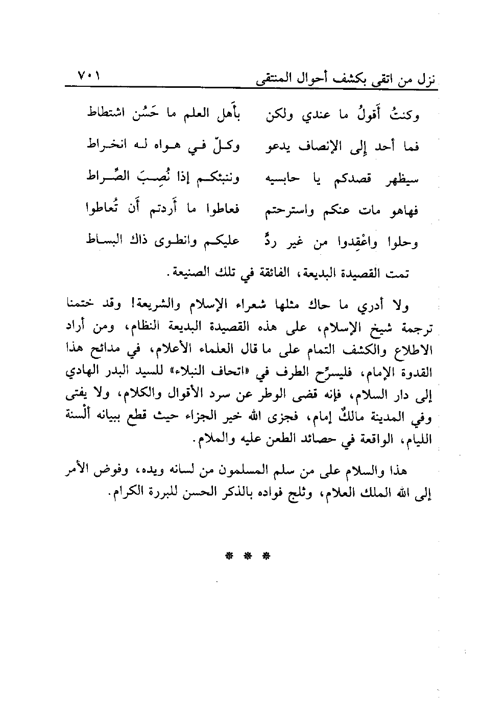ولا أدري ما حاك مثلها شعراء الإسلام والشريعة! وقد ختمنا ترجمة شيخ الإسلام، على هذه القصيدة البديعة النظام، ومن أراد الاطلاع والكشف التمام على ما قال العلماء الأعلام، في مدائح هذا القدوة الإمام، فليسرِّح الطرف في «اتحاف النبلاء» للسيد البدر الهادي إلى دار السلام، فإنه قضى الوطر عن سرد الأقوال والكلام، ولا يفتى وفي المدينة مالكٌ إمام، فجزى الله خير الجزاء حيث قطع ببيانه ألْسنة الليام، الواقعة في حصائد الطعن عليه والملام.