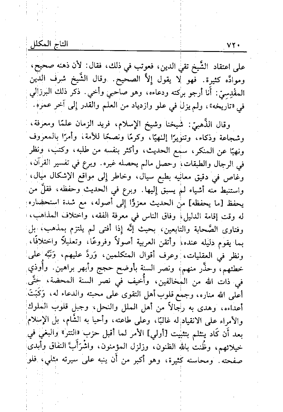 على اعتقاد الشَّيخ تقي الدين، فعوتب في ذلك، فقال: لأنه ذهنه صحيح، وموادَّه كثيرة. فهو لا يقول إِلاَّ الصحيح. وقال الشَّيخ شرف الدين المقْدِسِيّ: أَنا أرجو بركته ودعاءه، وهو صاحبي وأخي. ذكر ذلك البزالي في «تاريخه»، ولم يزل في علو وازدياد من العلم والقدر إِلى آخر عمره.