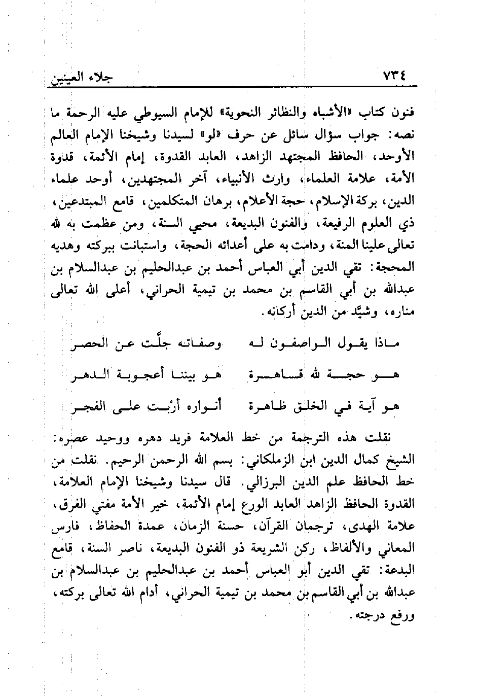 فنون كتاب «الأشباه والنظائر النحوية» للإمام السيوطي عليه الرحمة ما نصه: جواب سؤال سائل عن حرف «لو» لسيدنا وشيخنا الإمام العالم الأوحد، الحافظ المجتهد الزاهد، العابد القدوة، إمام الأئمة، قدوة الأمة، علامة العلماء، وارث الأنبياء، آخر المجتهدين، أوحد علماء الدين، بركة الإسلام، حجة الأعلام، برهان المتكلمين، قامع المبتعدين، ذي العلوم الرفيعة، والفنون البديعة، محيي السنة، ومن عظمت به لله تعالى علينا المنة، ودامت به على أعدائه الحجة، واستبانت ببركته وهديه المحجة: تقي الدين أبي العباس أحمد بن عبد الحليم بن عبد السلام بن عبد الله بن أبي القاسم بن محمد بن تيمية الحراني، أَعلى الله تعالى مناره، وشيَّد من الدين أركانه.
