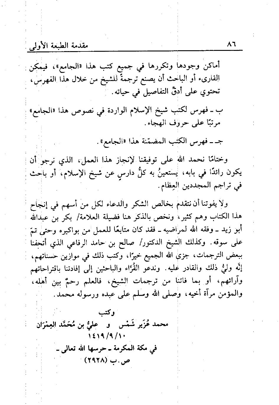 ولا يفوتنا أن نتقدم بخالص الشكر والدعاء لكل من أسهم في إنجاح هذا الكتاب وهم كثير، ونخص بالذكر هنا فضيلة العلامة / بكر بن عبد الله أبو زيد -وفقه الله لمراضيه- فقد كان متابعًا للعمل من بواكيره وحتى تم على سوقه. وكذلك الشيخ الدكتور / صالح بن حامد الرفاعي الذي أتحفنا ببعض الترجمات، جزى الله الجميع خيرًا، وكتب ذلك في موازين حسناتهم، إنَّه وليُّ ذلك والقادر عليه. وندعو القراء والباحثين إلى إفادتنا باقتراحاتهم وآرائهم، أو بما فاتنا من ترجمات الشيخ، فالعلم رحمٌ بين أهله، والمؤمن مرآة أخيه، وصلى الله وسلم على عبده ورسوله محمَّد.