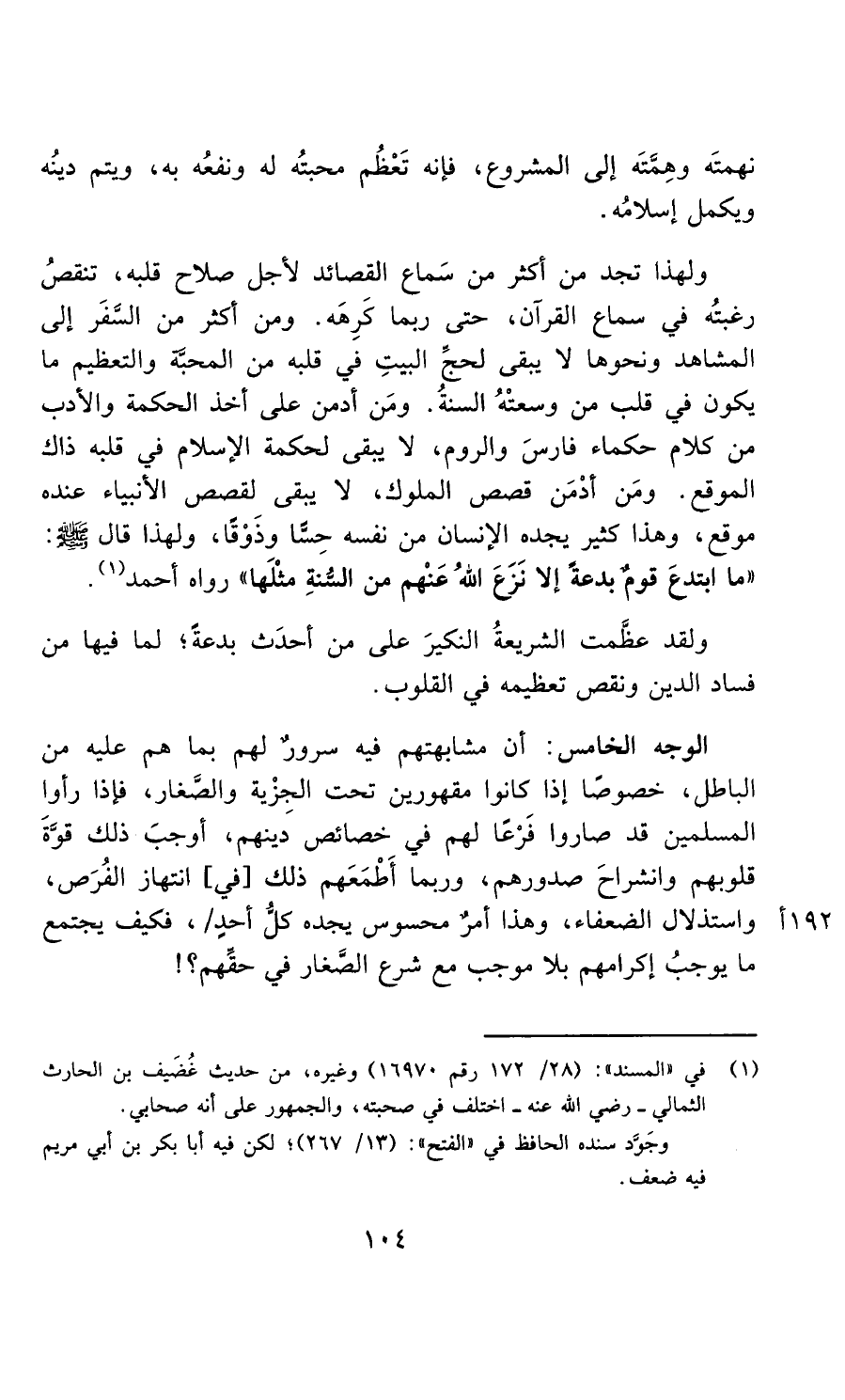 نهمته وهمته إلى المشروع، فإنه تعظم محبته له ومنفعته به، ويتم دينه به، ويكمل إسلامه، ولهذا تجد من أكثر من سماع القصائد لأجل صلاح قلبه تنقص رغبته في سماع القرآن حتى ربما يكرهه، ومن أكثر من السفر إلى المشاهد ونحوها لا يبقى لحج البيت في قلبه من المحبة والتعظيم ما يكون في قلب من وسعته السنة، ومن أدمن على أخذ الحكمة والآداب من كلام حكماء فارس والروم لا يبقى لحكمة الإسلام في قلبه ذاك الموقع، ومن أدمن على قصص الملوك لا يبقى لقصص الأنبياء عنده موقع، وهذا كثير يجده الإنسان من نفسه حسا وذوقا.