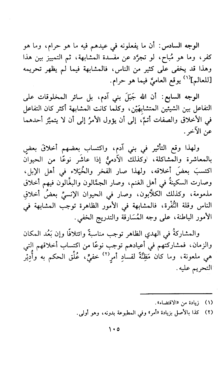 ولهذا وقع التأثير في بني آدم واكتساب بعضهم أخلاق بعض بالمعاشرة والمشاكلة، وكذلك الآدمي إذا عاشر نوعا من الحيوان اكتسب من بعض أخلاقه؛ ولهذا صار الفخر والخيلاء في أهل الإبل، وصارت السكينة في أهل الغنم، وصار الجمالون والبغالون فيهم أخلاق مذمومة، وكذلك الكلابون، وصار في الحيوان الإنسي بعض أخلاق الإنس وقلة النفرة، فالمشابهة في الأمور الظاهرة توجب المشابهة في الأمور الباطنة على وجه المسارقة والتدريج الخفي، والمشاركة في الهدي الظاهر توجب أيضا مناسبة وائتلافا وإن بعد المكان والزمان، فمشاركتهم في أعيادهم يوجب نوعا من اكتساب أخلاقهم التي هي ملعونة، وما كان مظنة لفساد أمر خفي علق الحكم به ودار التحريم عليه.