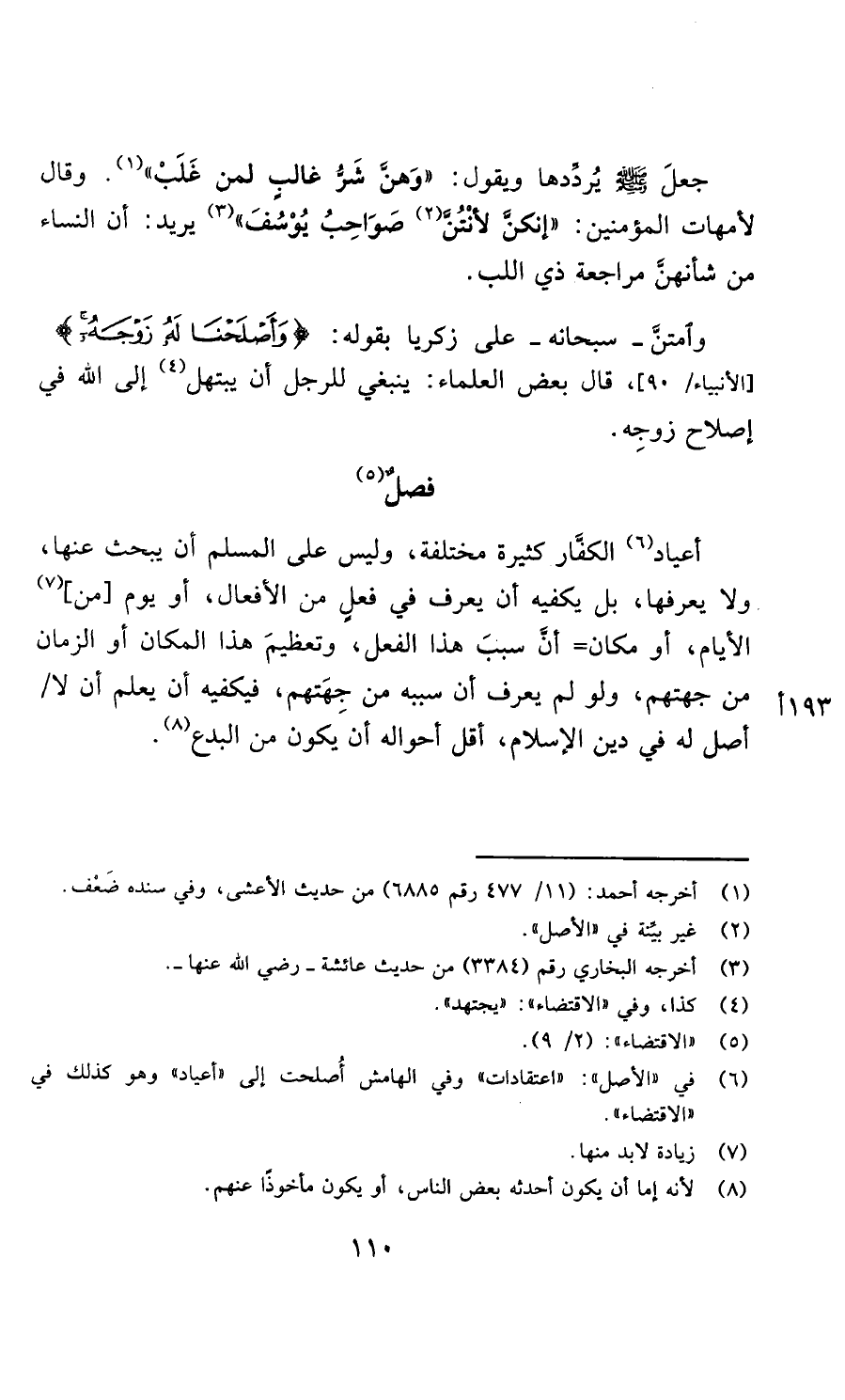 وقال لأمهات المؤمنين: إنكن لأنتن صواحب يوسف يريد أن النساء من شأنهن مراجعة ذي اللب، وامتن - سبحانه - على زكريا بقوله: وَأَصْلَحْنَا لَهُ زَوْجَهُ قال بعض العلماء: ينبغي للرجل أن يبتهل إلى الله في إصلاح زوجه له.