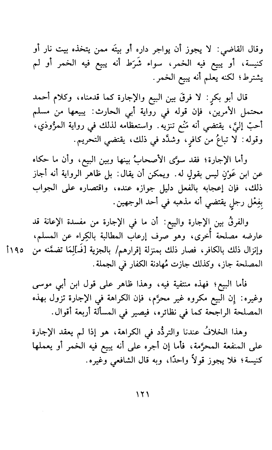 وقال القاضي: لا يجوز أن يؤاجر داره أو بيته ممن يتخذه بيت نار أو كنيسة، أو يبيع فيه الخمر سواء شرط أنه يبيع فيه الخمر أو لم يشترط، لكنه يعلم أنه يبيع فيه الخمر.