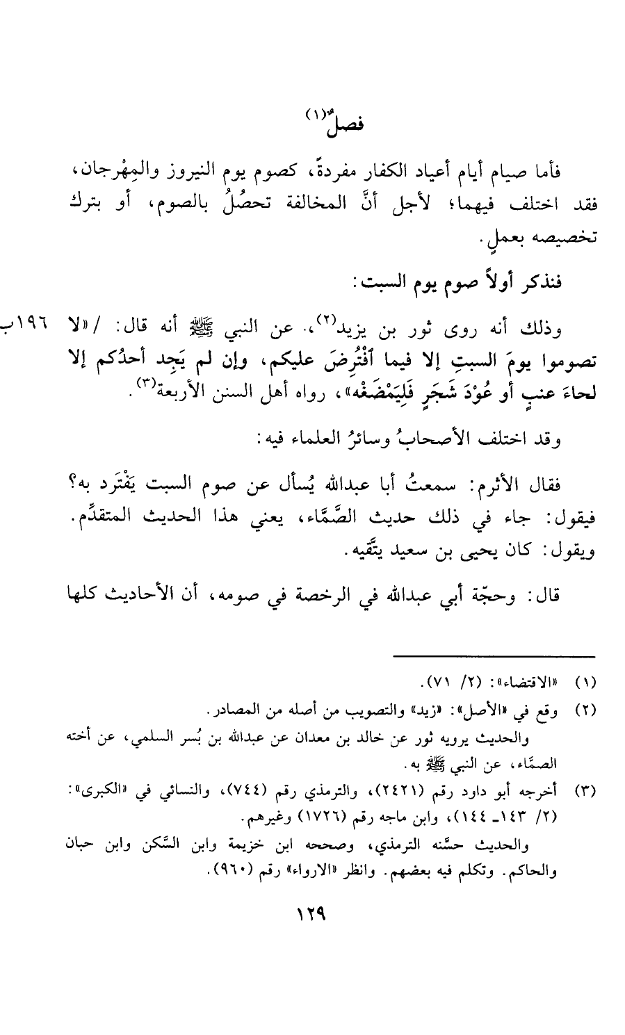 فأما صيام أيام أعياد الكفار مفردة كصوم "يوم النيروز" و"المهرجان " فقد اختلف فيهما لأجل أن المخالفة تحصل بالصوم أو بترك تخصيصه بعمل، فنذكر أولا صوم يوم السبت وذلك أنه روى ثور بن يزيد عن النبي - صلى الله عليه وسلم - أنه قال: لا تصوموا يوم السبت إلا فيما افترض عليكم، وإن لم يجد أحدكم إلا لحاء عنب أو عود شجرة فليمضغه رواه أهل السنن الأربعة.