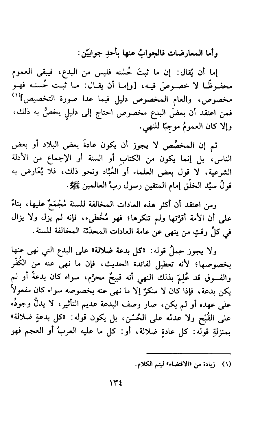 إما أن يقال: ما ثبت حسنه فليس من البدع، فيبقى العموم محفوظا لا خصوص فيه، فمن اعتقد أن بعض البدع مخصوص احتاج إلى دليل يخص به ذلك، وإلا كان العموم موجبا للنهي، ثم إن المخصص لا يجوز أن يكون عادة بعض البلاد أو بعض الناس، بل إنما يكون في الكتاب أو السنة أو الإجماع من الأدلة الشرعية، لا قول بعض العلماء أو العباد ونحو ذلك، فلا يعارض به قول سيد الخلق إمام المتقين، رسول رب العالمين - صلى الله عليه وسلم -، ومن اعتقد أن أكثر هذه العادات المخالفة للسنة مجمع عليها بناء على أن الأمة أقرتها ولم تنكرها فهو مخطئ، فإنه لم يزل ولا يزال في كل وقت من ينهى عن عامة العادات المحدثة المخالفة للسنة.