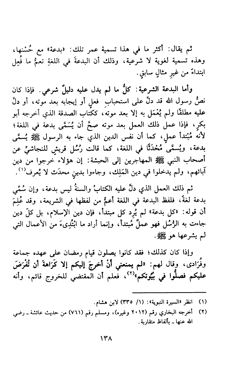 ثم ذلك العمل الذي دل عليه الكتاب والسنة ليس بدعة وإن سمي بدعة لغة فلفظ البدعة في اللغة أعم من لفظها في الشريعة، وقد علم أن قوله - صلى الله عليه وسلم -: "كل بدعة" لم يرد كل مبتدأ فإن دين الإسلام، بل كل دين جاءت به الرسل فهو عمل مبتدأ، وإنما أراد ما ابتدئ من الأعمال التي لم يشرعها هو - صلى الله عليه وسلم - وإذا كان كذلك فقد كانوا يصلون قيام رمضان على عهده جماعة وفرادى، وقال لهم: لم يمنعني أن أخرج إليكم إلا كراهة أن يفرض عليكم، فصلوا في بيوتكم فعلم أن المقتضي للخروج قائم، وأنه