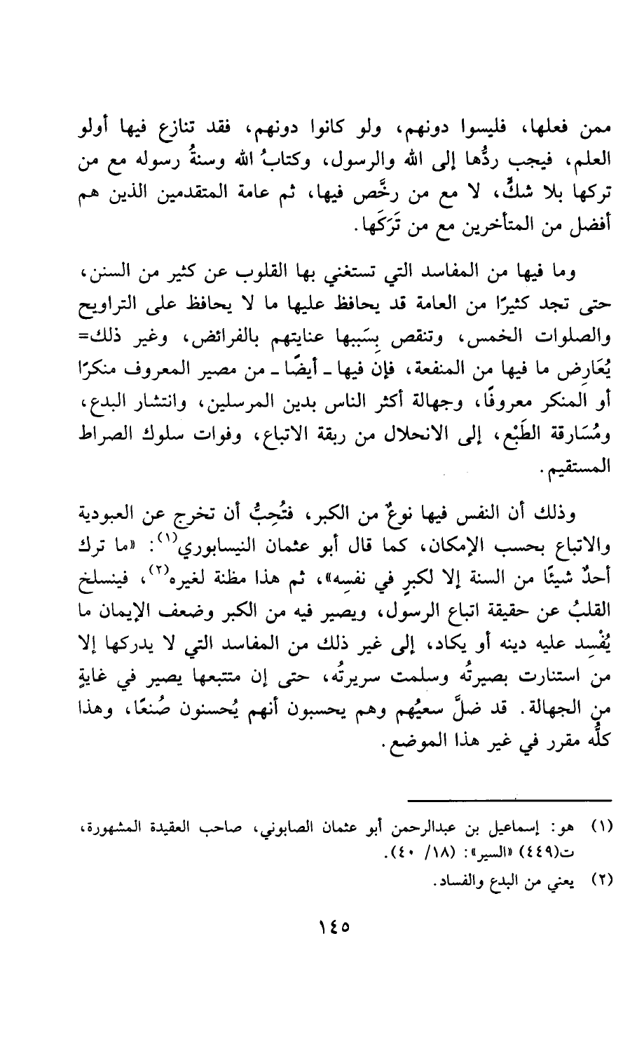 كما قال أبو عثمان النيسابوري - رحمه الله -: "ما ترك أحد شيئا من السنة إلا لكبر في نفسه"، ثم هذا مظنة لغيره، فينسلخ القلب عن حقيقة اتباع الرسول، ويصير فيه من الكبر وضعف الإيمان ما يفسد عليه دينه أو يكاد، إلى غير ذلك من المفاسد التي لا يدركها إلا من استنارت بصيرته، وسلمت سريرته، حتى إن متبعها يصير في غاية من الجهالة، قد ضل سعيهم وهم يحسبون أنهم يحسنون صنعا.