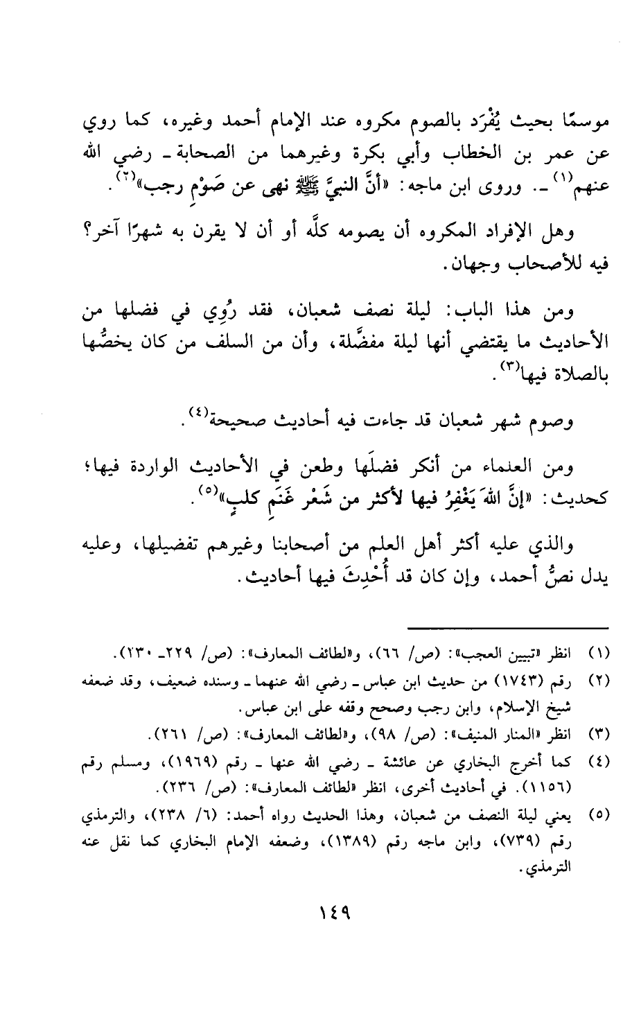 ومن هذا الباب: ليلة نصف شعبان، فقد روي في فضلها من الأحاديث ما يقتضي أنها ليلة مفضلة، وكثير من السلف من كان يخصها بالصلاة فيها، وصوم شهر شعبان قد جاءت فيه أحاديث صحيحة، ومن العلماء من أنكر فضلها، وطعن في الأحاديث الواردة فيها كحديث: إن الله يغفر فيها لأكثر من عدد شعر غنم كلب والذي عليه أكثر أهل العلم من أصحابنا وغيرهم تفضيلها، وعليه يدل نص أحمد، وإن كان قد أحدث فيها أحاديث،