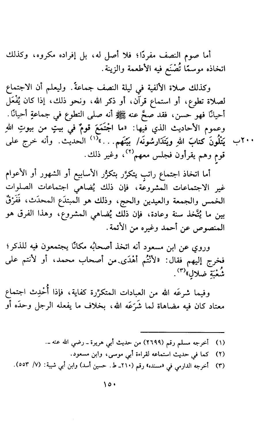 أما صوم النصف مفردا فلا أصل له، بل إفراده مكروه، وكذلك اتخاذه موسما تصنع فيه الأطعمة والزينة، وكذلك "صلاة الألفية" في ليلة النصف جماعة، وليعلم أن الاجتماع لصلاة تطوع أو استماع قرآن أو ذكر الله ونحو ذلك إذا كان يفعل ذلك أحيانا فهو حسن، فقد صح عنه صلى الله عليه وسلم أنه صلى التطوع في جماعة أحيانا، وعموم الأحاديث التي فيها ما اجتمع قوم في بيت من بيوت الله يتلون كتاب الله ويتدارسونه بينهم ... الحديث وأنه خرج على قوم وهم يقرؤون، فجلس معهم وغير ذلك.