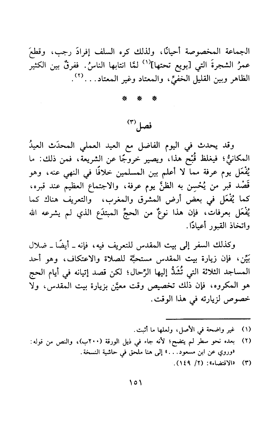 وكذلك السفر إلى بيت المقدس للتعريف فيه، فإنه - أيضا - ضلال مبين، فإن زيارة بيت المقدس مستحبة للصلاة والاعتكاف، وهو أحد المساجد الثلاثة التي تشد إليها الرحال، لكن قصد إتيانه في أيام الحج هو المكروه، فإن ذلك تخصيص وقت معين بزيارة بيت المقدس ولا خصوص لزيارته في هذا الوقت،