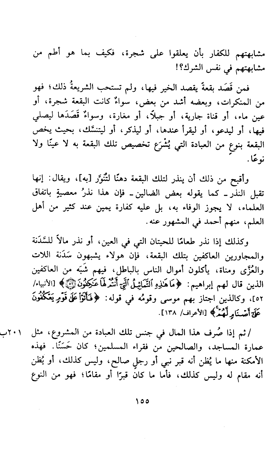 فمن قصد بقعة يقصد الخير فيها - ولم تستحب الشريعة ذلك - فهو من المنكرات وبعضه أشد من بعض، سواء كانت البقعة شجرة أو غيرها أو قناة جارية أو جبلا أو مغارة، وسواء قصدها ليصلي فيها، أو ليدعو، أو ليقرأ عندها، أو ليذكر أو لينسك بحيث يخص البقعة بنوع من العبادة التي لم يشرع تخصيص تلك البقعة به لا عينا ولا نوعا، وأقبح من ذلك أن ينذر لتلك البقعة دهنا لتنور ويقال: إنها تقبل النذر - يقوله بعض الضالين - فإن هذا نذر معصية باتفاق العلماء لا يجوز الوفاء به، بل عليه كفارة يمين عند كثير من أهل العلم، منهم أحمد في المشهور عنه، وكذلك إذا نذر طعاما للحيتان التي في العين، أو نذر مالا للسدنة والمجاورين العاكفين بتلك البقعة، فإن هؤلاء تشبهوا بسدنة اللات والعزى ومناة، يأكلون أموال الناس بالباطل، [والمجاورون] فيهم شبه من العاكفين الذين قال لهم إبراهيم: مَا هَذِهِ التَّمَاثِيلُ الَّتِي أَنْتُمْ لَهَا عَاكِفُونَ وكالذين اختارهم موسى [من] قومه في قوله: فَأَتَوْا عَلَى قَوْمٍ يَعْكُفُونَ عَلَى أَصْنَامٍ لَهُمْ ثم إذا صرف هذا المال في جنس تلك العبادة من المشروع، مثل عمارة المساجد والصالحين وفقراء المسلمين كان حسنا.