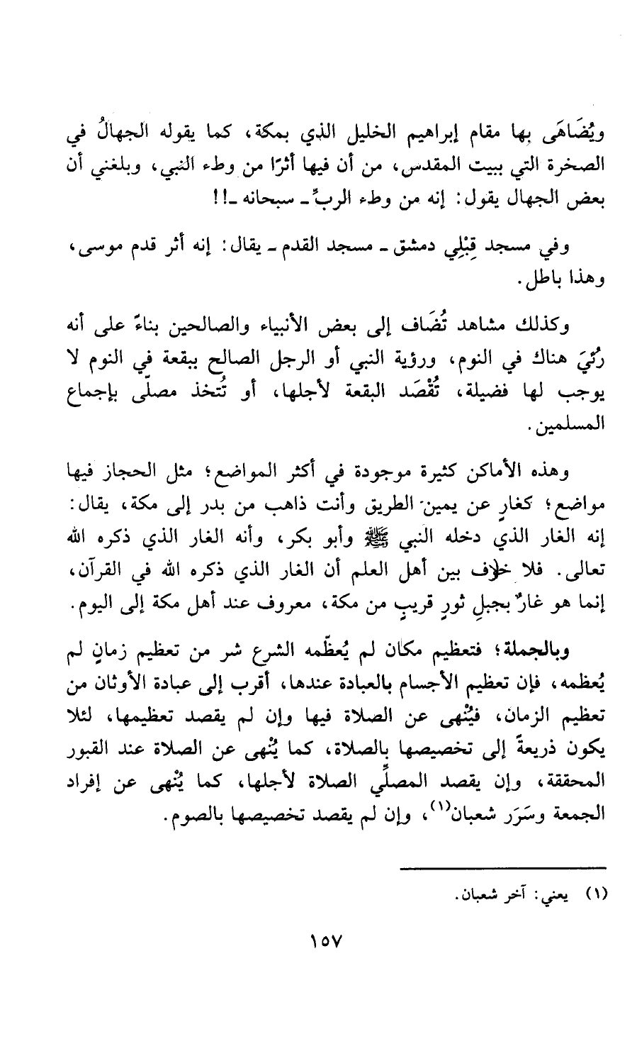 وفي مسجد قبلي دمشق: مسجد القدم، يقال: إنه أثر قدم موسى، وهذا باطل، وكذلك مشاهد تضاف إلى بعض الأنبياء والصالحين بناء على أنه رؤي هناك في النوم، ورؤية النبي أو الرجل الصالح ببقعة في المنام لا يوجب لها فضيلة تقصد البقعة لأجلها، أو تتخذ مصلى بإجماع المسلمين، وهذه الأماكن كثيرة موجودة في أكثر المواضع، مثل الحجاز، فيها مواضع كغار عن يمين الطريق وأنت ذاهب من بدر إلى مكة يقال: إنه الغار الذي دخله النبي صلى الله عليه وسلم هو وأبو بكر، وإنه الغار الذي ذكره الله - تعالى - ولا خلاف بين أهل العلم أن هذا الغار الذي ذكره الله في القرآن إنما هو غار بجبل ثور قريب من مكة معروف عند أهل مكة إلى اليوم.