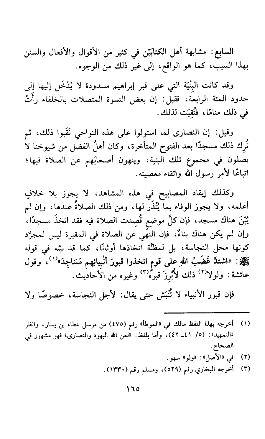 السابع: مشابهة أهل الكتابين في كثير من الأقوال والأفعال والسنن بهذا السبب كما هو الواقع، إلى غير ذلك من الوجوه، وقد كانت البنية التي على قبر إبراهيم - عليه السلام - مسدودة لا يدخل إليها إلى حدود المائة الرابعة، فقيل: إن بعض النسوة المتصلات بالخلفاء رأت في ذلك مناما؛ فنقبت لذلك، وقيل: إن النصارى لما استولوا على هذه النواحي نقبوا ذلك، ثم ترك ذلك مسجدا بعد الفتوح المتأخرة، وكان أهل الفضل من شيوخنا لا يصلون في مجموع تلك البنية، وينهون أصحابهم عن الصلاة فيها؛ اتباعا لأمر رسول الله صلى الله عليه وسلم واتقاء معصيته، وكذلك إيقاد المصابيح في هذه المشاهد مطلقا لا يجوز، بلا خلاف أعلمه، ولا يجوز الوفاء بما ينذر لها.