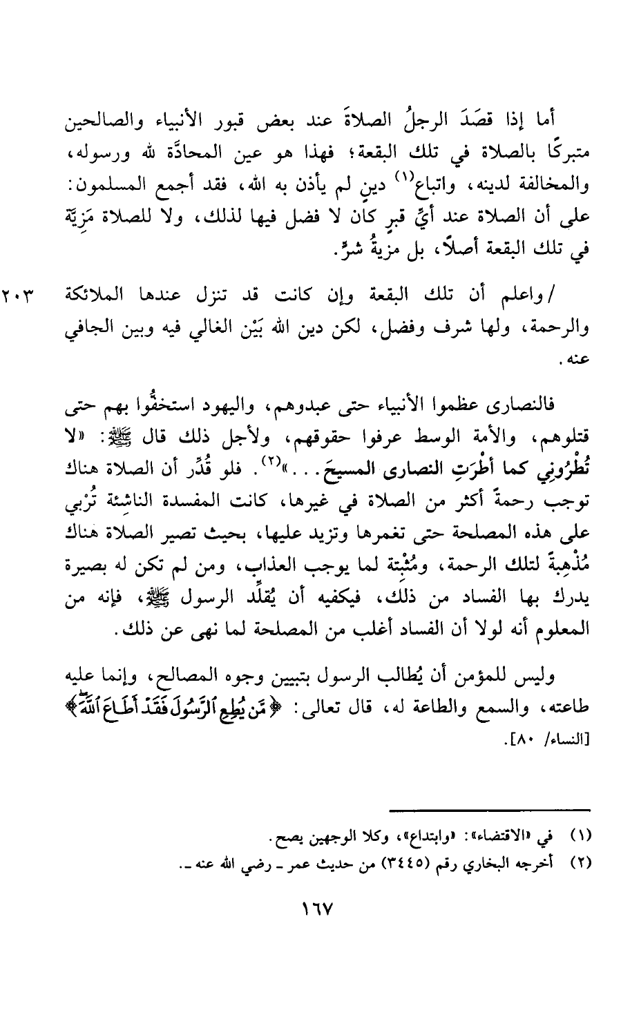 واعلم أن تلك البقعة وإن كان قد تنزل عندها الملائكة والرحمة ولها شرف وفضل، لكن دين الله بين الغالي فيه وبين الجافي عنه، فالنصارى عظموا الأنبياء حتى عبدوهم، واليهود استخفوا بهم حتى قتلوهم، والأمة الوسط عرفوا حقوقهم؛ ولأجل ذلك قال صلى الله عليه وسلم: لا تطروني كما أطرت النصارى المسيح فلو قدر أن الصلاة هناك توجب رحمة أكثر من الصلاة في غيرها كانت المفسدة الناشئة تربي على هذا المصلحة حتى تغمرها وتزيد عليها، بحيث تصير الصلاة هناك مذهبة لتلك الرحمة، ومثبتة لما يوجب العذاب، ومن لم تكن له بصيرة يدرك بها الفساد الناشئ من ذلك، فيكفيه أن يقلد الرسول صلى الله عليه وسلم، فإنه من المعلوم، أنه لولا أن الفساد أغلب من المصلحة لما نهي عن ذلك.
