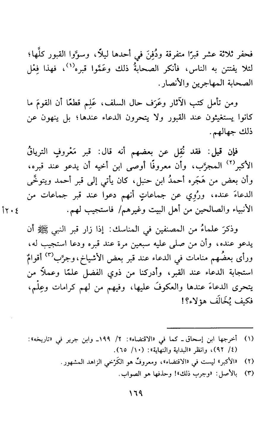 فإن قيل قد نقل عن بعضهم أنه قال: "قبر معروف الترياق الأكبر المجرب" وأن معروفا أوصى ابن أخيه أن يدعو عند قبره، وأن بعض من هجره أحمد بن حنبل يأتي إلى قبر أحمد ويتوخى الدعاء عنده، وروي عن جماعات أنهم دعوا عند قبور جماعات من الأنبياء والصالحين من أهل البيت وغيرهم فاستجيب لهم، وقد ذكر علماء من المصنفين في المناسك إذا زار قبر النبي صلى الله عليه وسلم أن يدعو عنده وأن من صلى عليه سبعين مرة عند قبره ودعا استجيب له، ورأى بعضهم منامات في الدعاء عند قبر بعض الأشياخ، وجرب ذلك أقوام استجابة الدعاء عند القبر، وأدركنا من ذوي الفضل علما وعملا من يتحرى الدعاء عندها والعكوف عليها، وفيهم من له عند الناس كرامات وعلم، فكيف يخالف هؤلاء؟.